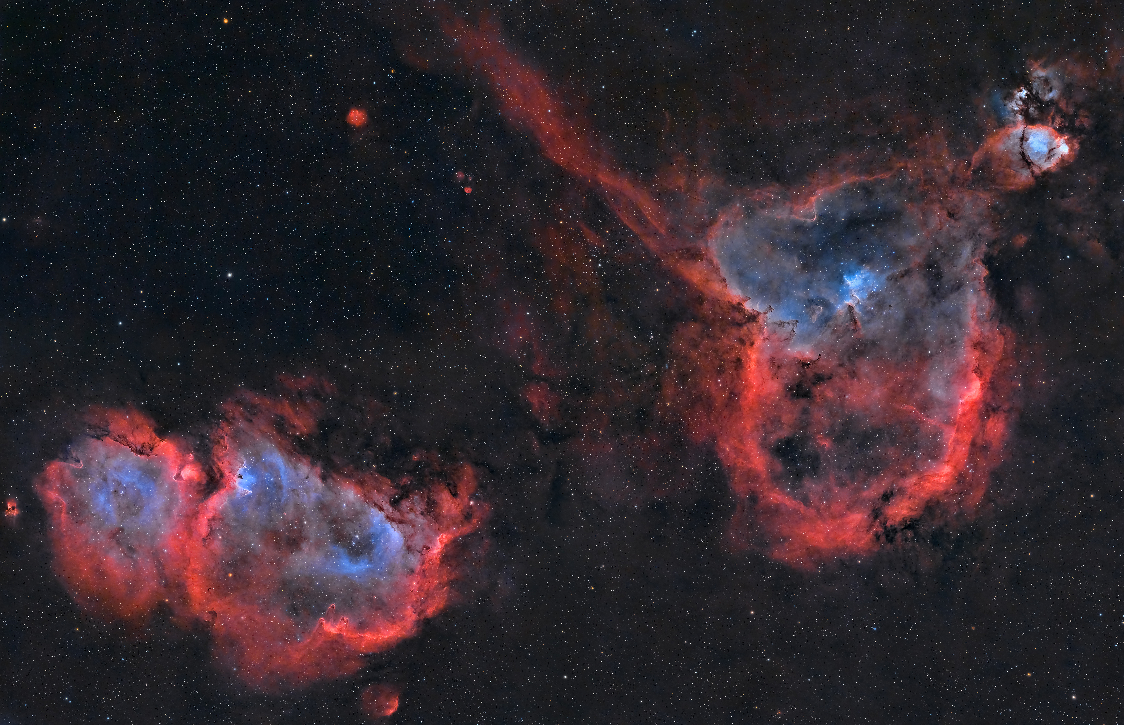 Dieses Foto ist ein 2x2-Mosaik des wunderschönen Himmelsflecks im Sternbild Kassiopeia an der Grenze zur Giraffe. Hier liegen die berühmten Herz- und Seelennebel sehr nahe beieinander und es war schon immer eines meiner Ziele, sie gemeinsam zu fotografieren. Der Seelennebel (auch bekannt als Embryonebel oder unter den Katalogakronymen IC 1848, Sh2-199 und W5) und der Herznebel (auch bekannt als Running Dog oder unter den Katalogakronymen IC 1805, Sh2-190 und W4). diffuse Nebel, die mit offenen Clustern junger, heißer Sterne mit hoher Masse verbunden sind. Das Nebelpaar ist etwa 7500 Lichtjahre von der Erde entfernt und wurde am 3. November 1787 von William Herschel entdeckt. Der hellste Teil des Herznebels (der sogenannte Fischkopf) wird separat als NGC 896 klassifiziert, da es sich um den ersten Teil handelte des zu entdeckenden Nebels.