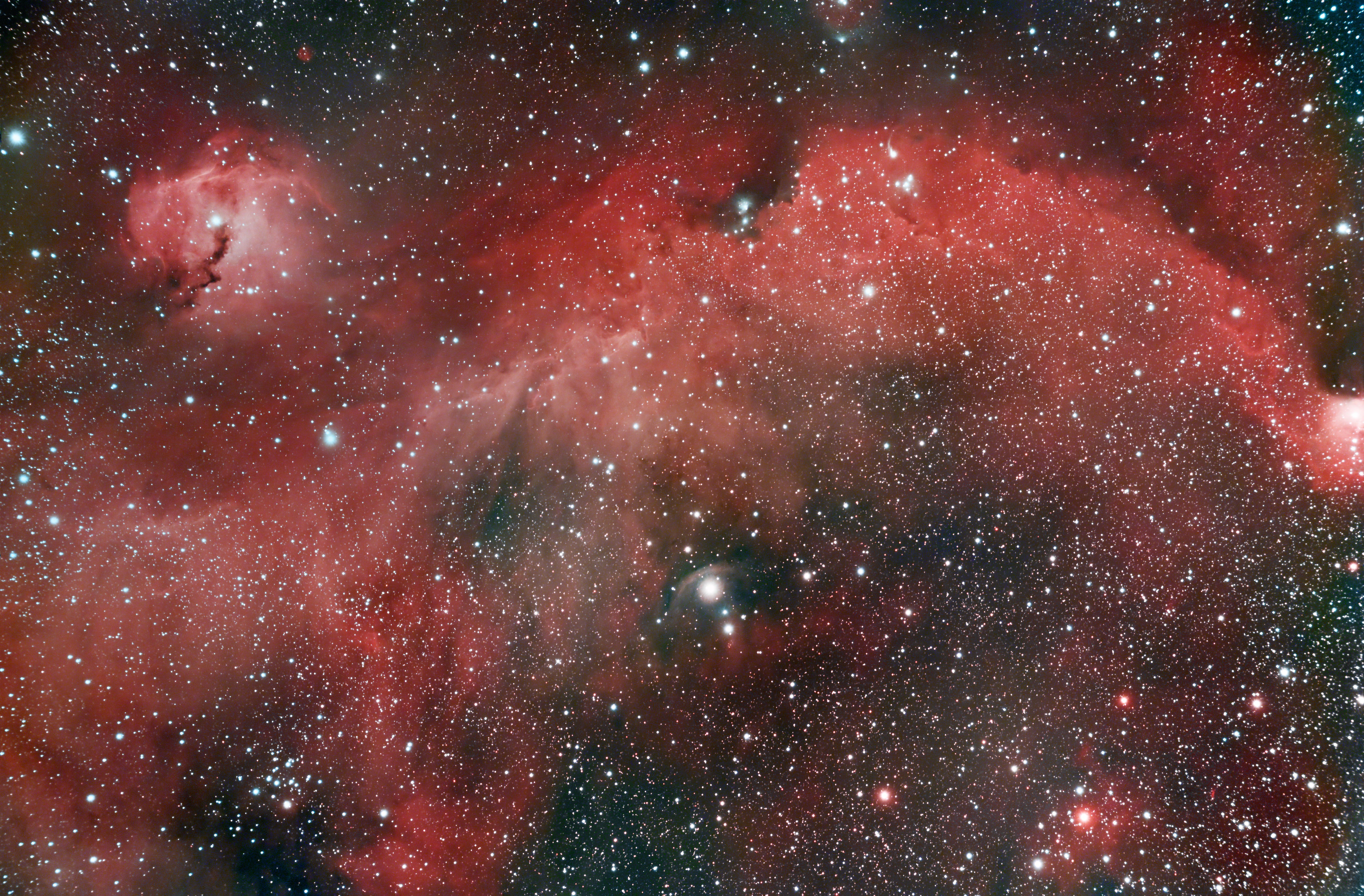 SH2-296 Seemöwenflügel mit 3,2 Stunden Belichtungszeit. Der Komplex aus Gas- und Staubwolken mit weiteren Sternen der Canis-Majoris-OB1-Assoziation umfasst etwa 200 Lichtjahre. Der Möwennebel ist ungefähr 3800 Lichtjahre von uns entfernt. Der breite Möwennebel ist wahrscheinlich Teil einer größeren Hüllenstruktur, die von aufeinanderfolgenden Supernovaexplosionen gefegt wurde. Er ist als Sh2-296 und IC 2177 katalogisiert. Der markante Bogen rechts unter der Mitte ist die Bugwelle des Ausreißersterns FN Canis Majoris. In der Mitte ist eine Gasblase erkennbar und oben im Flügel, rechts neben dem Riss ist eine Verzerrung (kleiner Lichtbogen) was auf eine Gravitationsverzerrung hinweisen könnte.