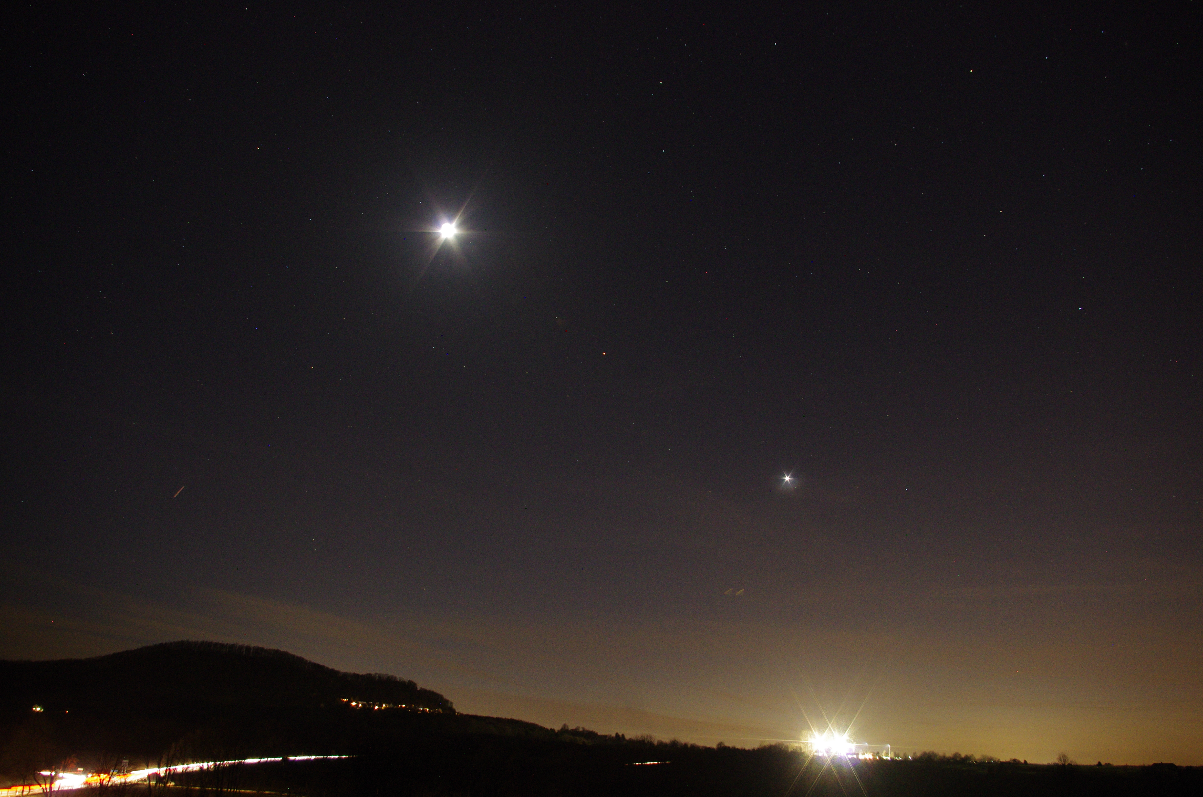 Passend zum Motto des diesjährigen Astronomietages (Sehenswertes an der Sonnenbahn) habe ich diese Aufnahme gemacht. Von links nach rechts: Mond, Mars und Venus.