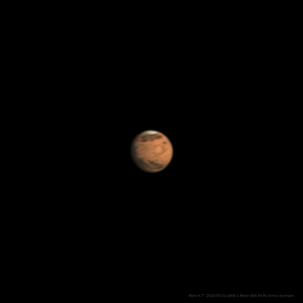 Gute Bedingungen am 31. Mai 2023 gegen 20:00 Uhr Ortszeit haben diese Aufnahme von Mars ermöglicht. Trotz nur noch 4,7 Bogensekunden Durchmesser sind einige Details sichtbar.