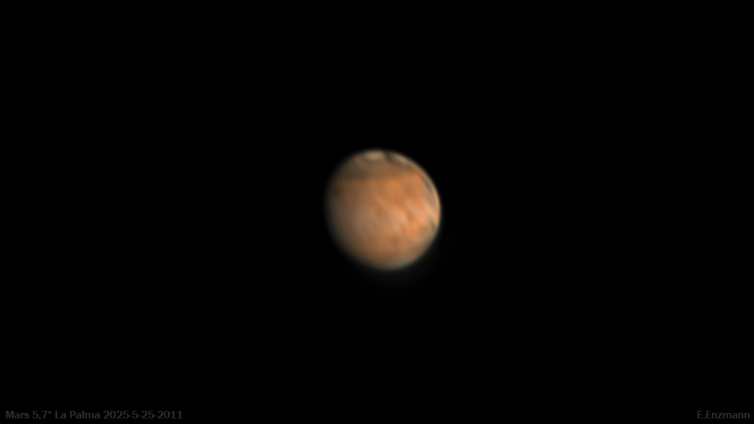 Mars mit nur noch 5,7 Bogensekunden vom 25. Mai 2025 aus La Palma. Dennoch sind einige Details und vor allem viele Wolken sichtbar.