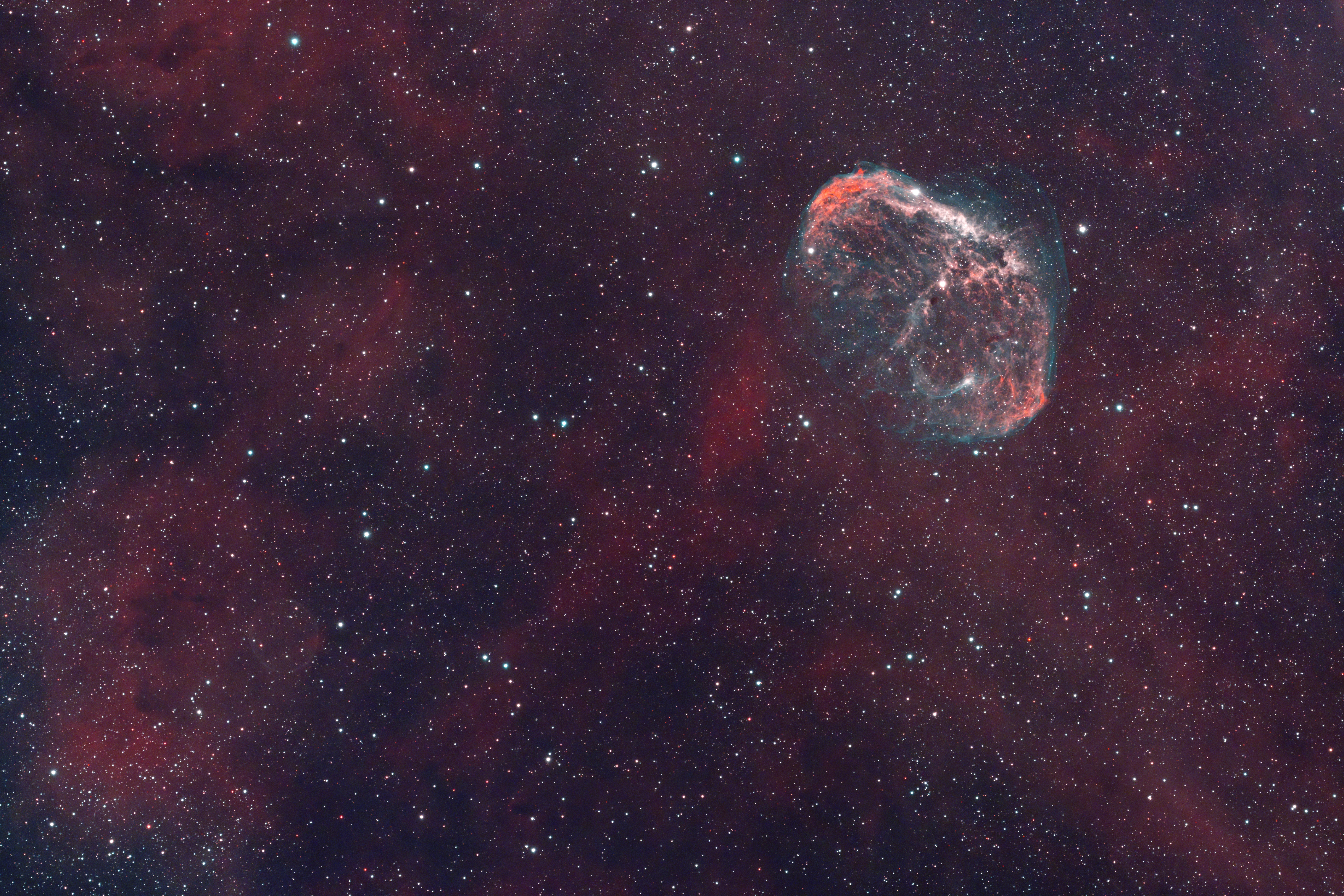 Im Juli 2020 habe ich auf meiner Berliner Dachterrasse zwei Nächte lang NGC 6888 und den Soap Bubble Nebel PN G75.5+1.7 belichtet. Die Verwendung eines Zweiband-Schmalbandfilters (Optolong L-eXtreme) und einer empfindlichen Kamera (ASI 2600MC) erlaubte trotz Großstadtlichts eine deutliche Abbildung des [OIII]-Kokons um NGC 6888. Der erst 2008 entdeckte "Soap Bubble Nebula" ist nahe der linken unteren Bildecke zu finden.