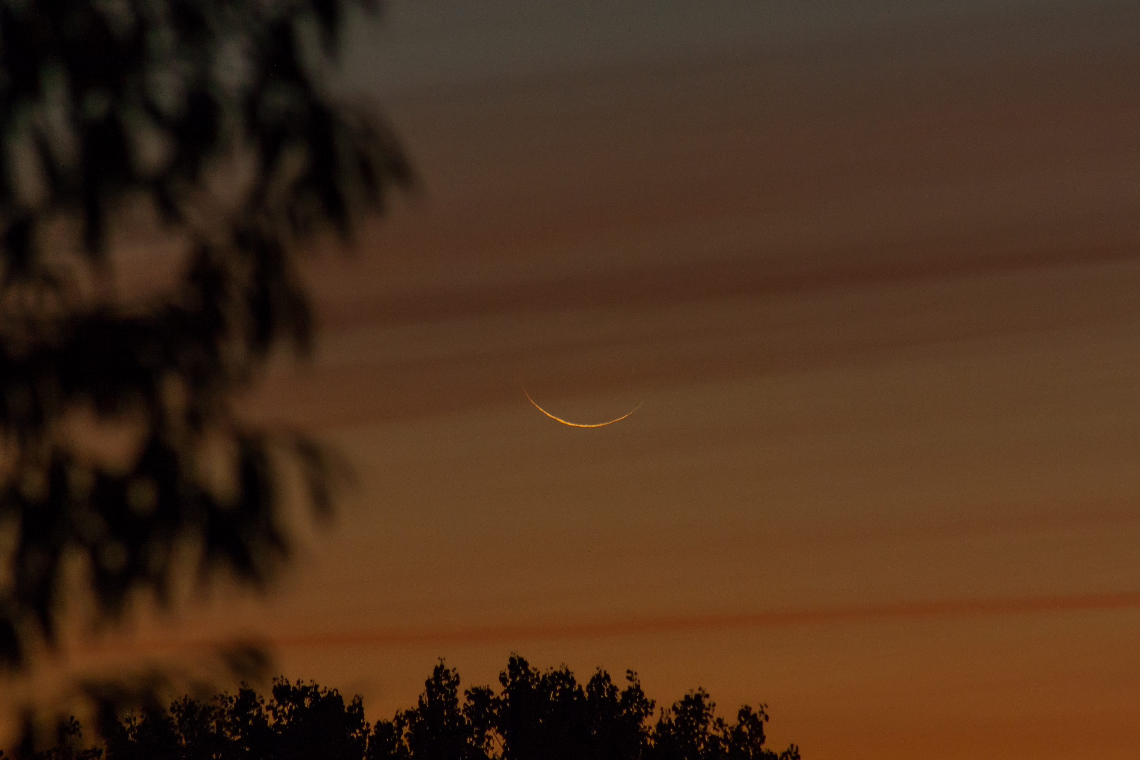 Die Mondsichel zeigte sich heute früh in der Morgendämmerung fast horizontal – wie ein Boot. Der Mond befand sich während der Dämmerung ziemlich direkt oberhalb der Sonne, so dass er von »unten« beleuchtet wurde. Dies ist in unseren Breiten sehr selten, während es in den Tropen zum gewohnten Bild gehört. Es ist für dieses Jahr auch das kürzeste Zeitintervall zwischen einer einfachen Sichtung und Neumond. (22,5 Stunden vor Neumond)