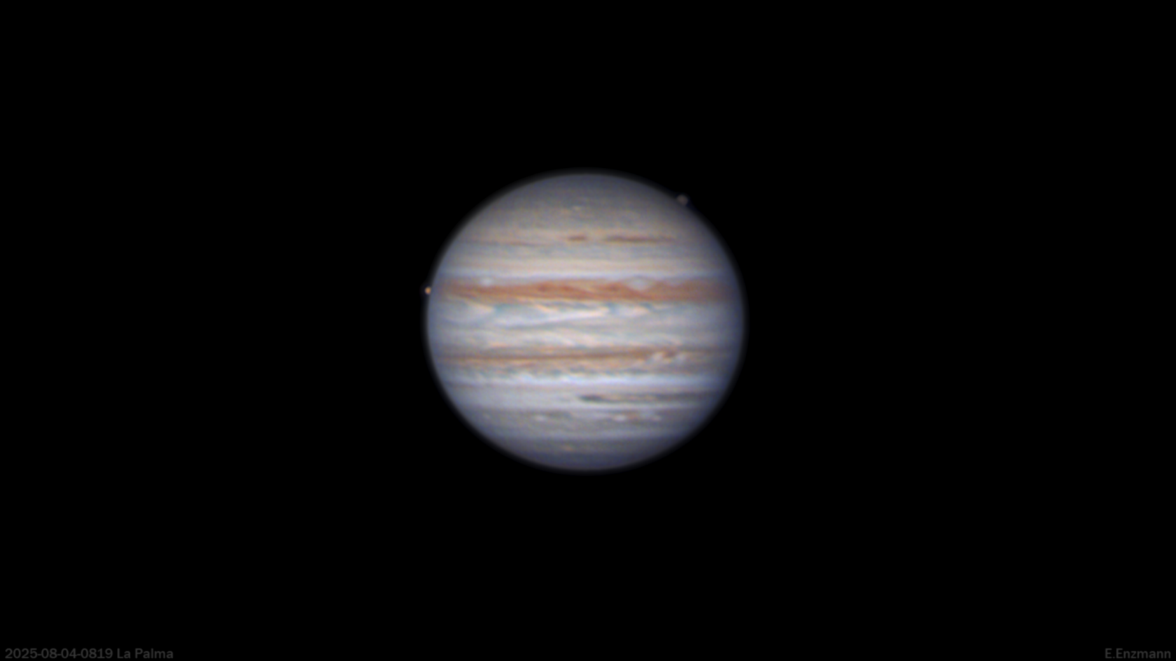 Eine schöne Jupiter-Konstellation mit zwei Halbmonden am Rand des Planeten von La Palma am 4. August 2025. Der Mond Io links taucht gerade hinter Jupiter auf, und der selten sichtbare Mond Callisto wird gerade von Jupiter verdeckt. Beide Monde sind etwa zur Hälfte sichtbar. Dies ist ein Tageslichtbild, dessen Bearbeitung zwei- bis dreimal so lange dauerte wie eine Nachtaufnahme von Jupiter. Das Teleskop wurde während der Belichtung mit 25 % Öffnung betrieben.