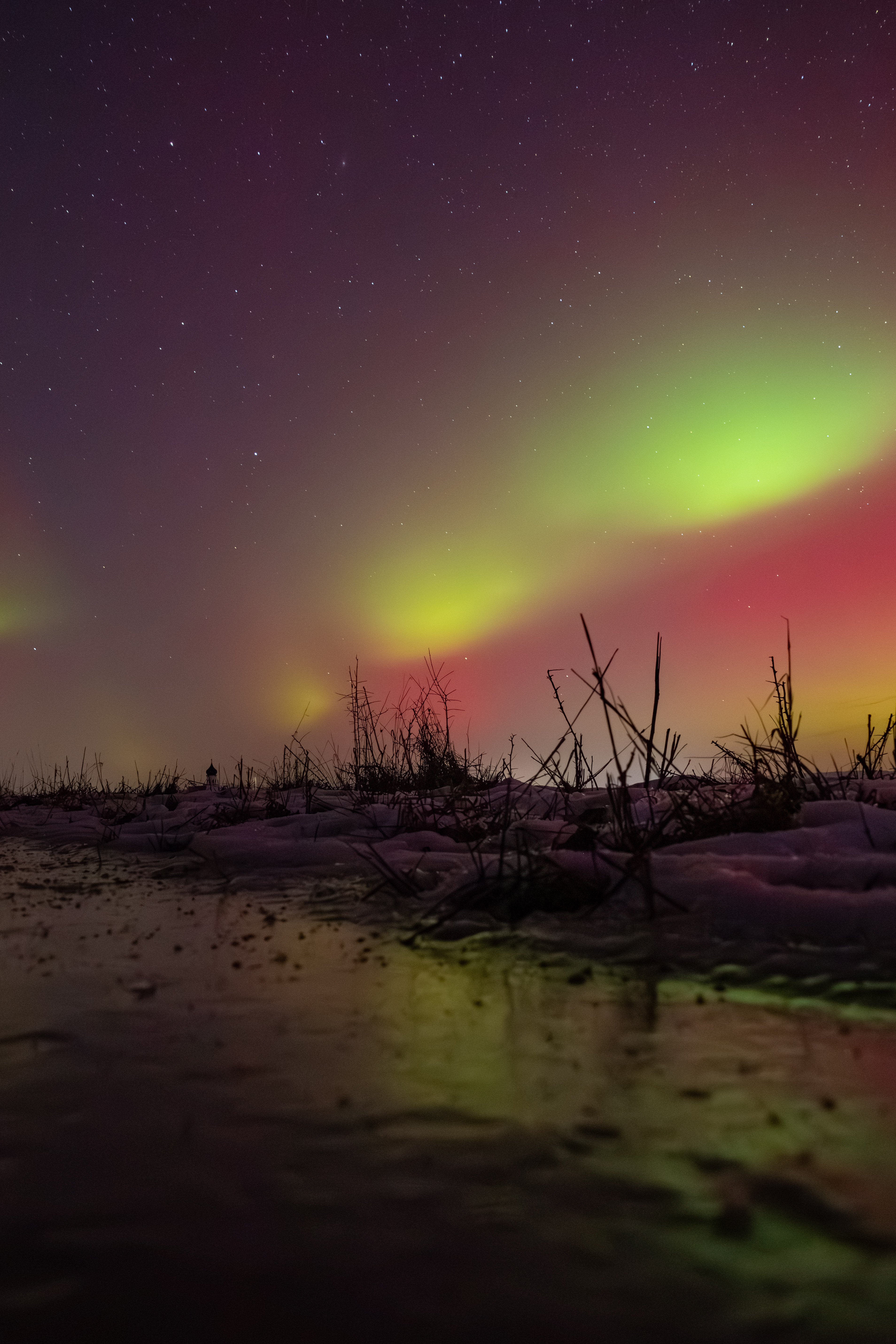 Polarlichter sind in Bayern normalerweise nicht zu sehen, aber in dieser Nacht waren sie über mehr als eine Stunde hinweg mit bloßem Auge erkennbar. Entdeckt habe ich sie zunächst durch ein Dachfenster, kurz darauf bin ich nach draußen gefahren, um die Lichter außerhalb der Siedlung auf einem Feldweg ohne störende Lichtquellen zu fotografieren. Dort zeigten sich die Polarlichter deutlich intensiver, begünstigt durch einen wolkenfreien Himmel. Auf diesem Foto ist zusätzlich eine Spiegelung der Polarlichter auf einer vereisten Fläche zu sehen.
