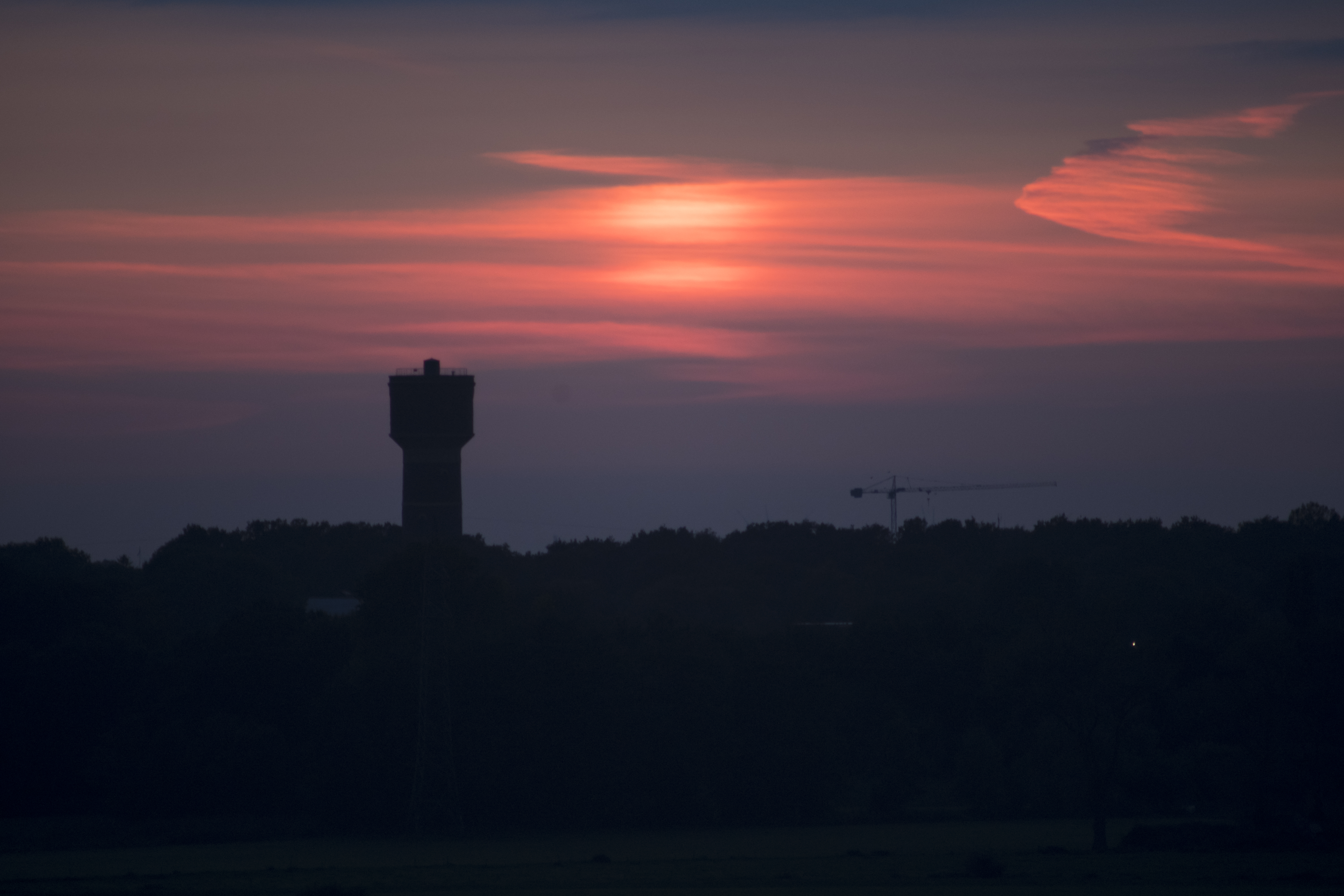 Aufnahme des Wasserturms Oldenburg von der Autobahnbrücke aus, die Sonne stand ca 4° unter dem Horizont. Die scheinbare Sonne war in der Wolkenschicht etwa 20 min zu sehen.