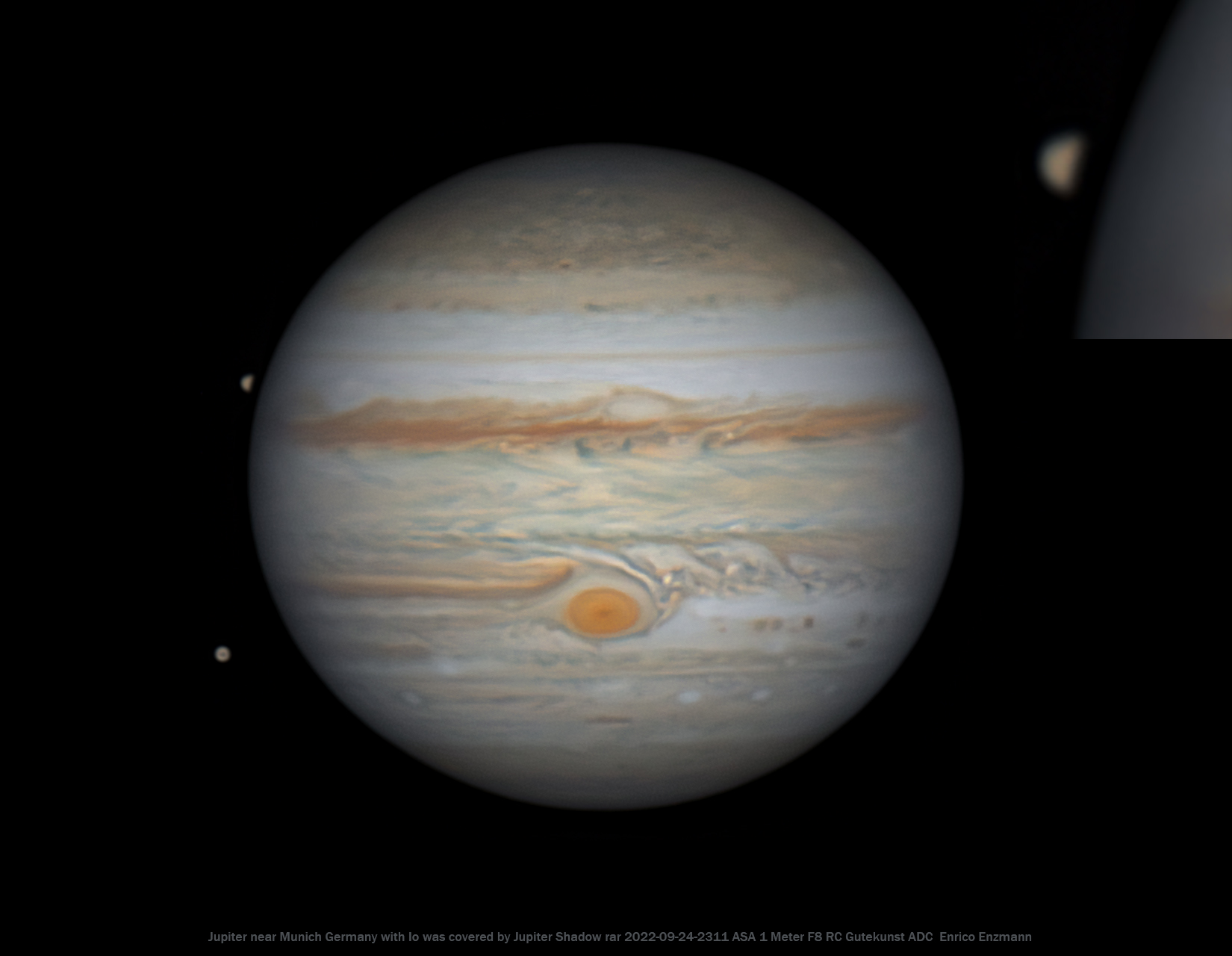 Am 24. September 2022 war das Wetter alles andere als gut. Es war komplett bedeckt und es regnete Tag und Nacht. Ich wollte gerade ins Bett gehen, als gegen Mitternacht plötzlich unverhofft der Regen aufhörte und der Himmel immer wieder mal kurz aufmachte. Ich richtete das 1-Meter-ASA-Teleskop auf Jupiter, da ich wusste, dass der Rote Fleck zu dieser Zeit recht gut zu sehen war. In einer der kurzen Wolken und Nebel Lücken in dieser Nacht gelang mir dieses sehr selten bisher dokumentierte Bild von Jupiter. Es zeigt nicht nur schön den Roten Fleck in der Mitte sondern auch noch dessen Mond Europa weiter unten und oben den Mond Io, der und das ist wirklich selten gerade in dem Moment der Aufnahme von Schatten von Jupiter selbst verfinstert wird. Siehe hierzu auch den vergrößerten Ausschnitt rechts oben im Bild eingeblendet. Dies so genau in der Hälfte der Verfinsterung zu erwischen ist sehr schwer da das Zeit Fenster hierfür nur wenige Sekunden beträgt. Die Technik, die man normalerweise bei Jupiterbildern anwendet, mehrere Bilder innerhalb von etwa 10 Minuten zu machen und diese dann zu derotieren und zusammen zu rechnen, funktioniert dabei natürlich nicht. Deswegen ist auch die Belichtungszeit mit nur insgesamt 90 Sekunden sehr sehr gering. In Anbetracht dessen ist die Aufnahme überraschend gut geworden.