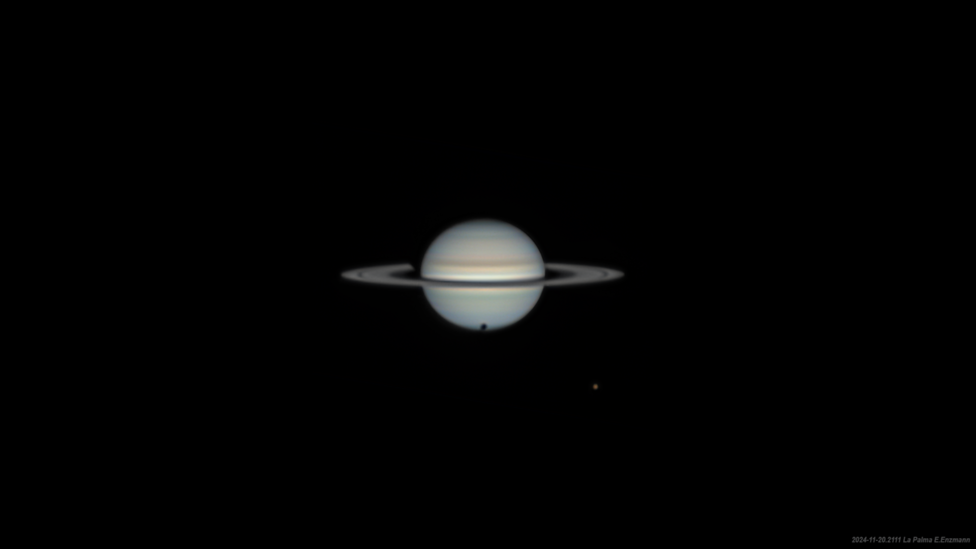 Am 20. November 2024 gab es eine recht seltene Konstellation von Saturn und dessen größten Mond Titan, der seinen Schatten auf die Saturnoberfläche warf. Leider war das Seeing nicht gut und dazu kamen das Wolken, welche die Aufnahme beendet haben. So konnte ich nur acht Videos a 60 Sekunden machen, was zu wenig ist, selbst wenn das Seeing gut ist. Normalerweise rechne ich solches Bildmaterial nicht durch, aber auf Grund des seltenen Ereignisses habe ich versucht, das Beste draus zu machen. Die Aufnahmen wurden off axis mit 25% der Öffnung vom Teleskop gemacht.