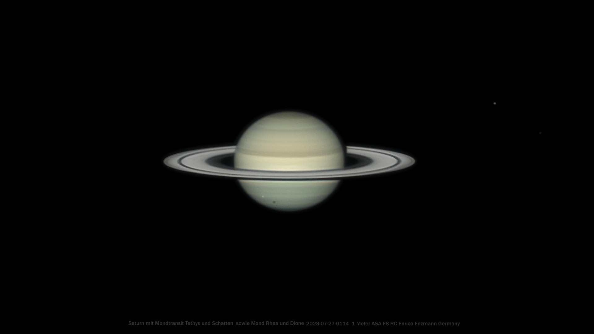 Am 27. Juli 2023 war der Himmel überraschenderweise klar, allerdings ließ das Seeing zu wünschen übrig. Das war ärgerlich, fand doch ein relativ seltener Monddurchgang mit Schattenwurf vom Saturnmond Tethys gegen 3 Uhr früh Ortszeit statt, auf den ich mich gefreut hatte. Glücklicherweise wurde wenigstens für gut sechs Minuten das Seeing dann doch noch besser, sodass ich dieses Event doch aufnehmen konnte. Das Bild ist zwar wegen der kurzen Belichtungszeit nicht ganz rauschfrei, zeigt aber schon einige schöne Details. Unterhalb des Rings etwas nach links sieht man den Saturnmond Tethys, der zu ca. 95% aus Eis besteht und mit rund 1060 km Durchmesser angegeben wird. Gut sichtbar ist auch der Schattenwurf auf die Planetenscheibe von Saturn weiter rechts unten. Ganz rechts außen im Bild sichtbar sind der hellere Mond Rhea und der dunklere Mond Dione.