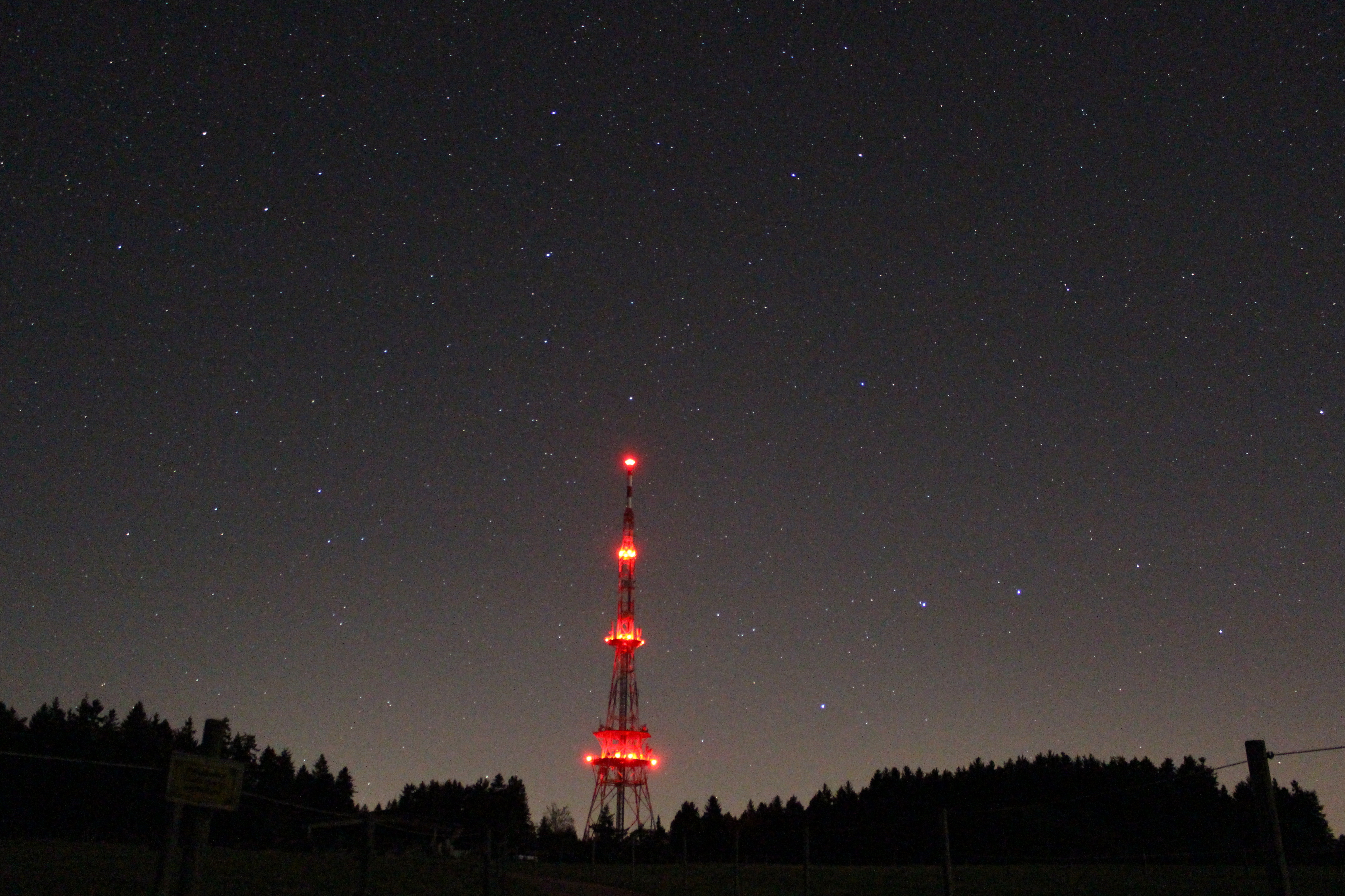 Der Sendeturm Langenbrand mit den Sternbildern Großer Bär und Drache im Hintergrund.