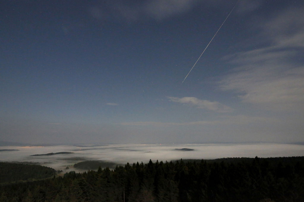 Für ein Zeitraffervideo erstellte ich unzählige Aufnahmen, Blickrichtung Osten. Bei der viertletzten Aufnahme von insgesamt 2768 Aufnahmen (alle 15 s) zog dieser Meteor mit seiner schönen Spur über den Himmel. Da ich zeitgleich eine nahende Gewitterfront im Westen beobachtete, entging mir diese helle Sternschnuppe, vermutlich einer der September-Epsilon-Perseiden.