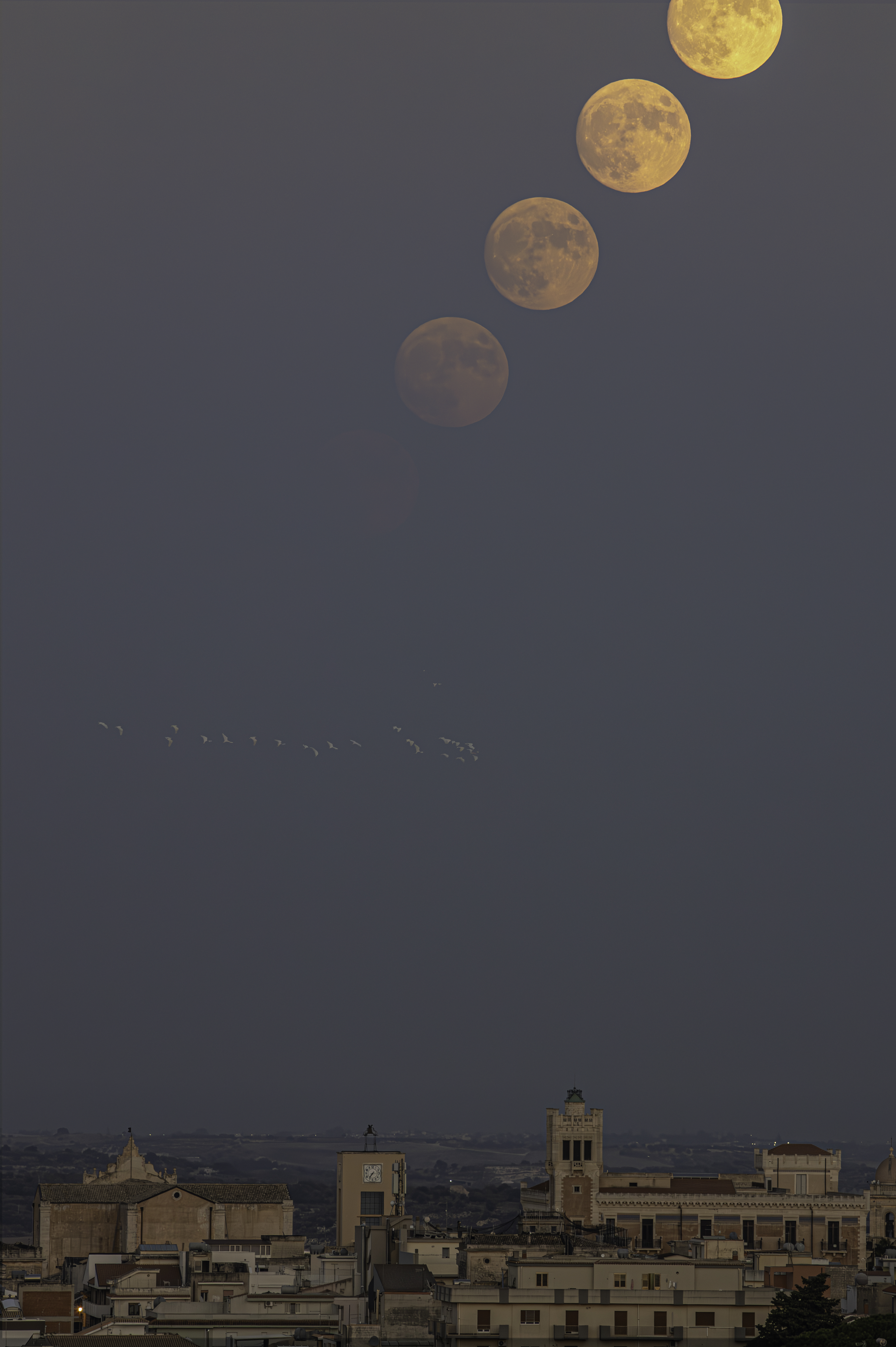 SEPTEMBER'S FULL MOON RISING WITH A FLOCK OF BIRDS.