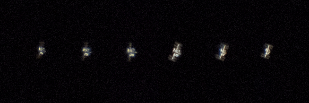 Bei einem Überflug der Internationalen Raumstation machte ich sechs Fotos, die eindrucksvoll die sich verändernde Ansicht der ISS zeigen. Alle Fotos entstanden am 80/480 mm Refraktor, von Hand nachgeführt bei ISO 2000 und 1/1000 Sekunde Verschlusszeit.