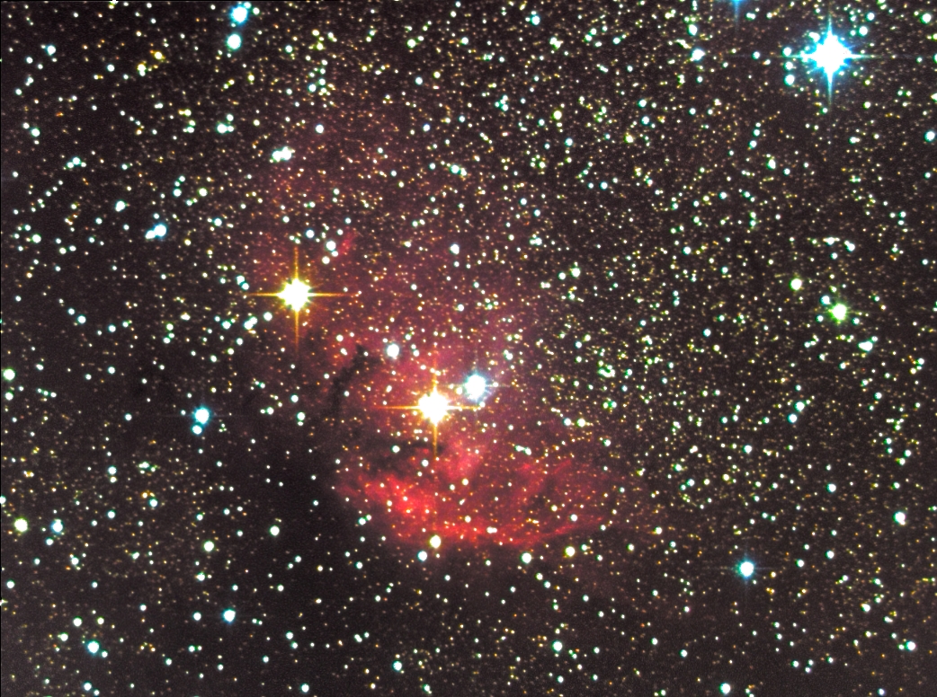 SH-101 (LBN171) ist eine kleine HII-Region mitten in der großen Cygnus-Sternwolke. Einige blaue Sterne vom Spektraltyp A0 und zwei rötliche K2-Sterne im Vordergrund bilden einen netten Kontrast.