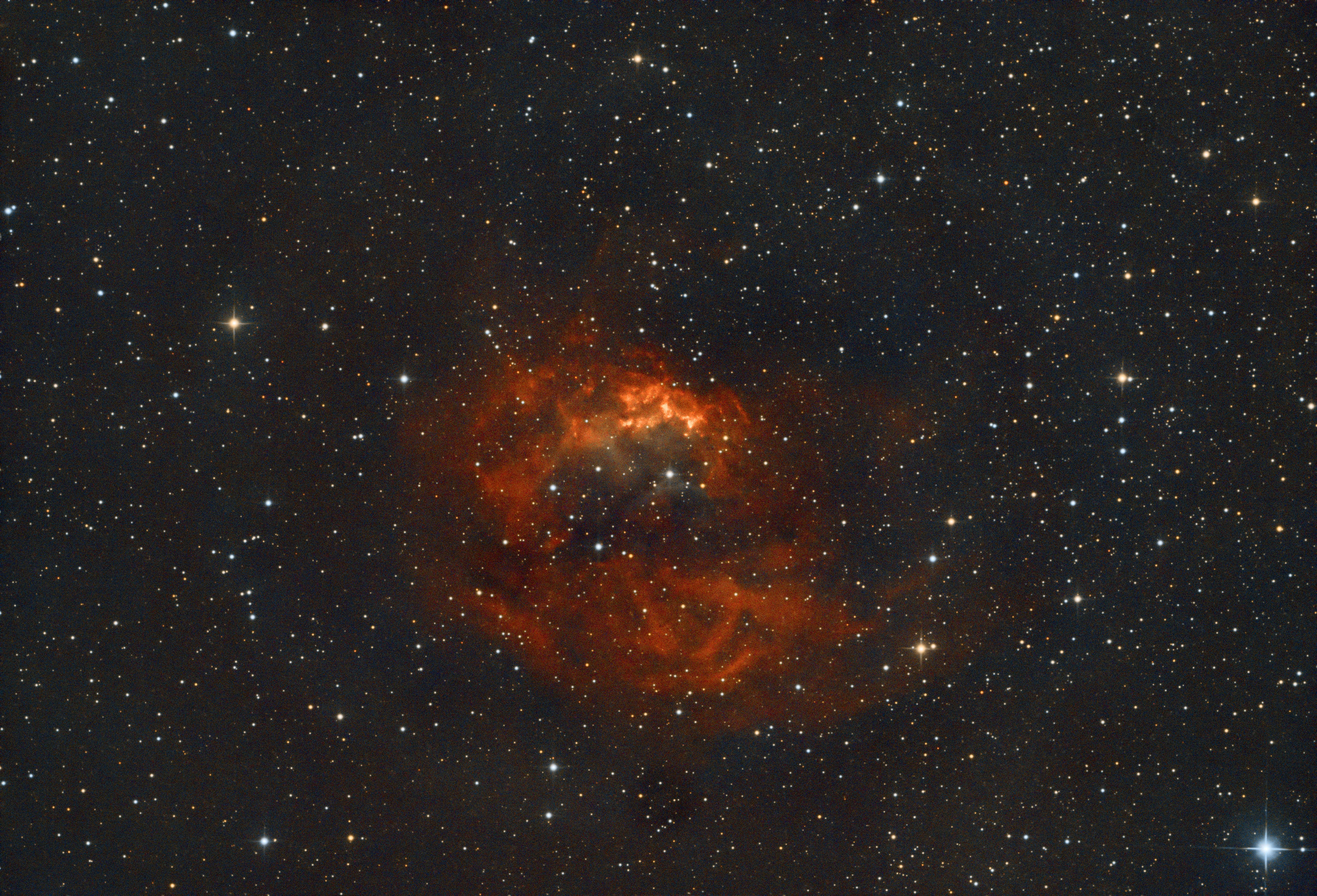 Die Nacht war zum Testen von Einstellungen gedacht. Aber in den leeren Raum muss man nun ja nicht fotografieren. Daher habe ich mir Sh2-261 ausgesucht. Der Mond stand noch gut zu 80% voll m Himmel, daher kam hier ein DNB Filter zum Einsatz. Bei Sh2-261 handelt es sich um eine H-II-Region in der Orion-Region. Diese steht schon bei Beginn der Nacht weit im Süden und verschwindet nach ca. 4 Stunden bereits am westlichen Horizont. Trotzdem kamen noch 3 Stunden Belichtungszeit zusammen
