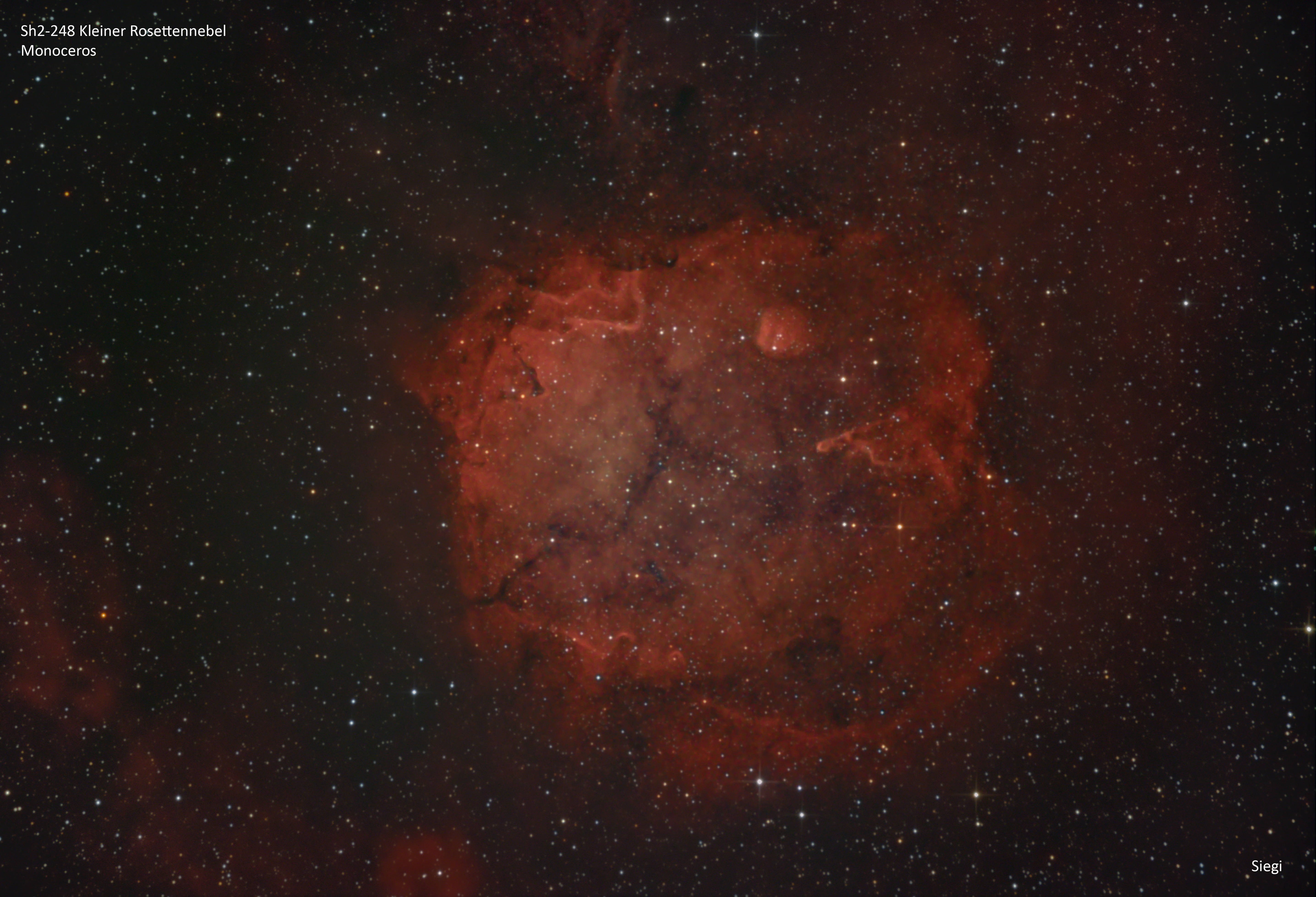 Auf der Suche nach weniger bekannten Objekten bin ich auf dieses hier gestoßen. Auf den ersten Blick dachte ich mir: OK wieder ein Elefantenrüssel, erst bei genauerer Analyse habe ich bemerkt – es ist doch was anderes, nämlich der kleine Rosettennebel Sh2-284. Habe noch nie was davon gehört. Dieser Nebel befindet sich auch nur unweit vom Original entfernt, ein bisschen süd-östlich. Sh2-284 ist eine HII-Sternentstehungsregion aus Gas und Staub im Sternbild Einhorn (Monoceros), etwa 15 Lichtjahre von der Erde entfernt. Entlang der Ränder von Sh2-284 befinden sich verschiedene Formationen. Dies sind riesige Gebilde aus Gas und Staub, die sich in die zentrale Leere des Nebels erstrecken. Die prominenteste Säule befindet sich auf der rechten Seite des Nebels, Er ähnelt dem Zeigefinger einer Hand, die auf die Sterne in der Mitte des Nebels zeigt. Diese Säulen werden durch intensive Strahlung und Sternwinde ins leben gerufen, die von den sehr heißen Sternen des zentralen offenen Sternhaufens mit der Bezeichnung Dolidze 25 ausgehen. Die Strahlung und der Wind des Clusters sind dafür verantwortlich, die zentrale Leere im umgebenden Nebel zu beseitigen.