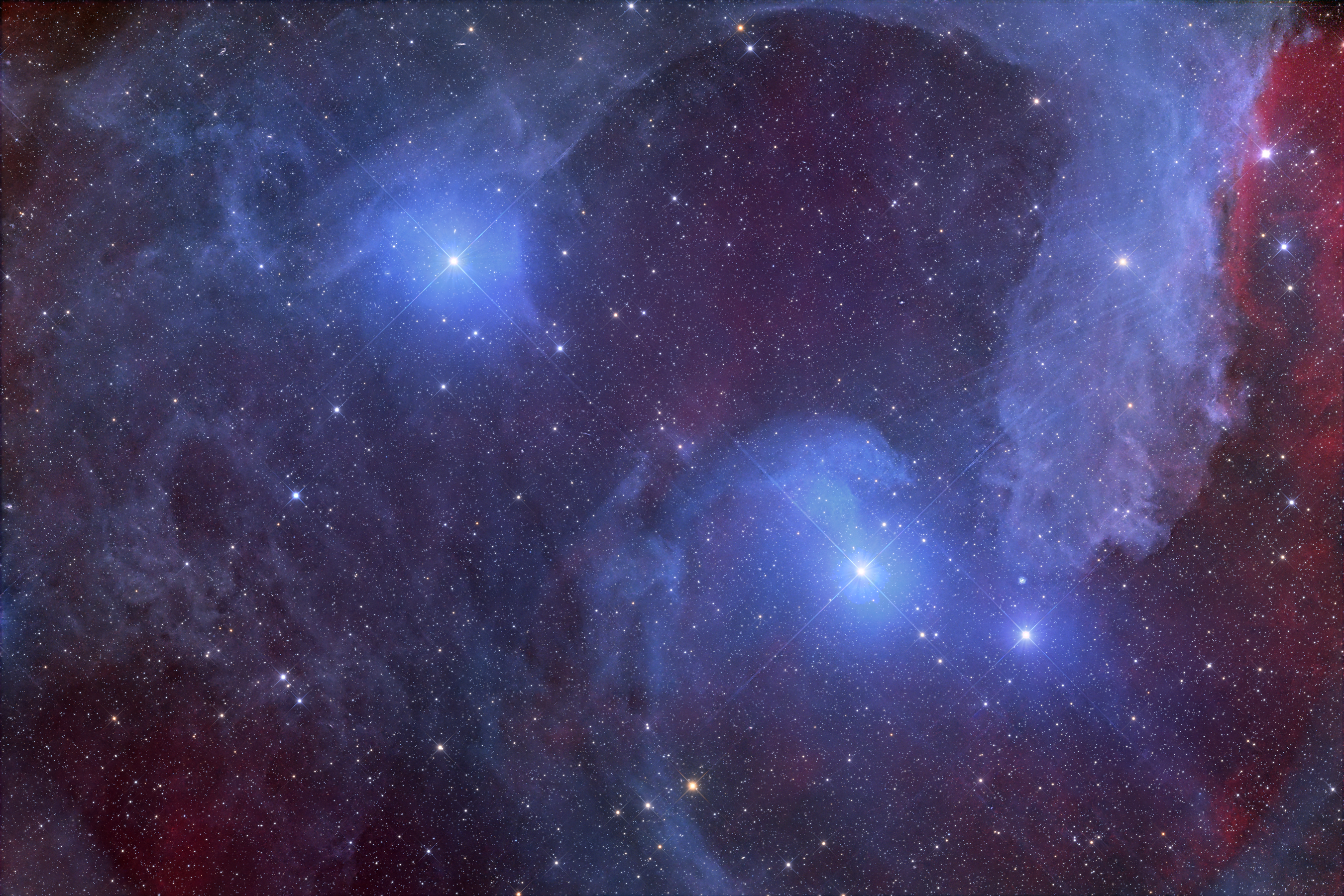 Diese Aufnahme zeigt den östlichen Teil von Sh2-1 einem bläulichen Reflexionsnebel im Sternbild Skorpion. Die rötlichen Anteile von Wasserstoff wurden durch den Einsatz eines H-alpha-Filters betont.