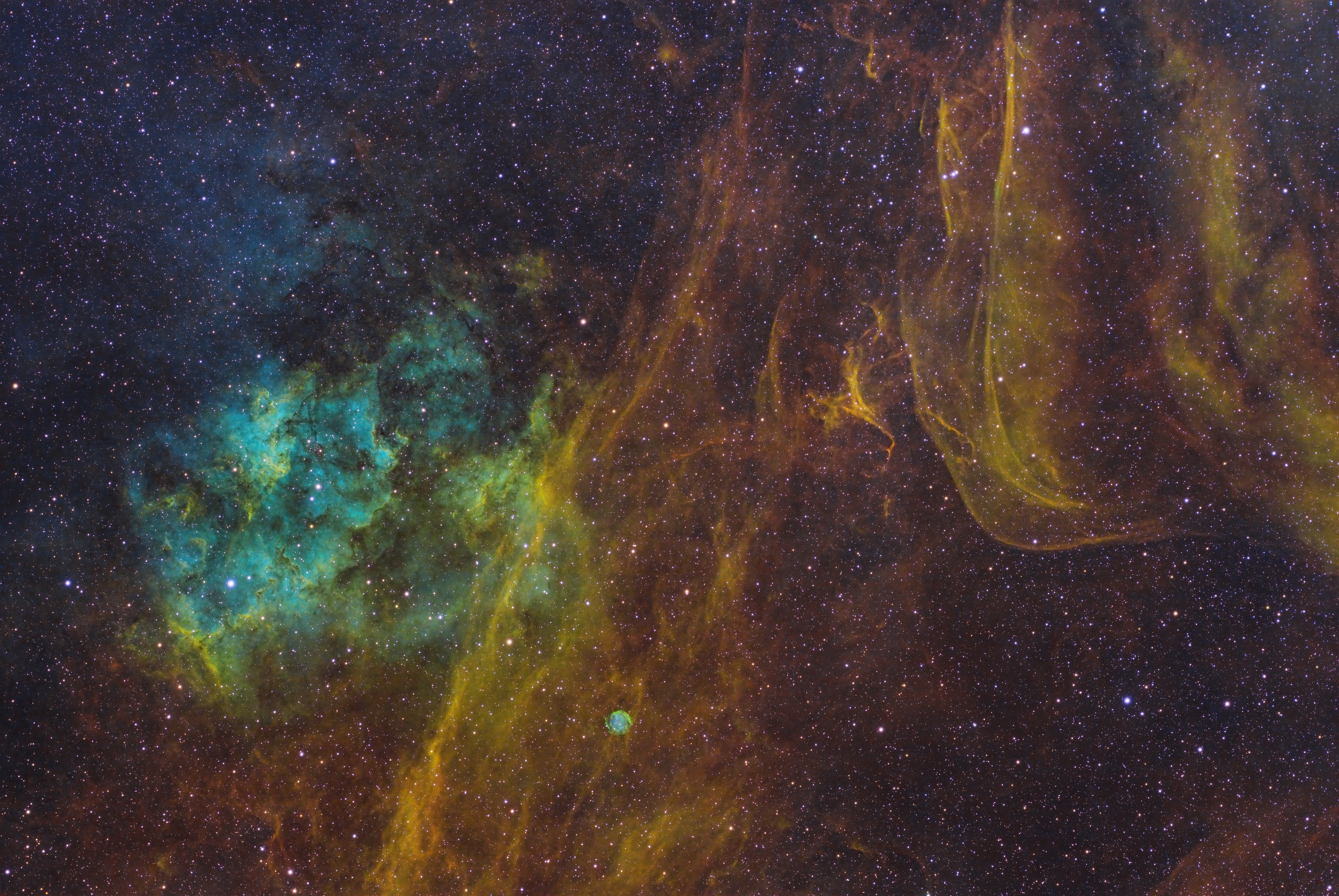 Sh2-115 ist ein 7500 Lichtjahre von uns entfernter Emissionsnebel in der Orionarmregion, der sich direkt hinter dem großen Nebelsystem des Schwarzen Lochs Cygnus X befindet, von dem er etwa 1600 Lichtjahre entfernt ist. Es handelt sich um eine HII-Region von beträchtlicher Ausdehnung mit ovaler Form, die in Nordwest-Südost-Richtung von einem dunklen Band durchzogen ist, das sie offenbar in zwei gleiche Teile teilt: Der östliche Teil wird von einem kleinen offenen Cluster namens Berkeley dominiert 90, mit dem er physikalisch verbunden ist, während der westliche Teil in Richtung des veränderlichen Sterns α2 CVn HD 196178 (V2015 Cyg) liegt, mit einer durchschnittlichen scheinbaren Helligkeit von 5,63 mag. Sh2-116 ist ein kleiner Emissionsnebel (unten mittig im Foto), der sich am nördlichen Rand des viel größeren Sh2-115 befindet. Dieser Nebel hat eine kreisförmige Form, so dass er im Sharpless-Katalog als möglicher planetarischer Nebel angegeben wird. Tatsächlich glaubte man auch später, dass dies der Fall sei, und zwar so weit, dass darin verschiedene Katalogbezeichnungen für planetarische Nebel angegeben werden. Eine Studie aus dem Jahr 1991 stellte jedoch klar, dass es sich tatsächlich um eine HII-Region handelt, ihre Entfernung ist jedoch trotz dieser Studie immer noch unbekannt. Gesamtbelichtung 7 h, in 2 kurzen Nächten. Aufgenommen habe ich das Objekt mit der Toupet Mono Camera 2600, Filter 4,5nm Ha, SII, O3, Bearbeitet in SHO Hubblepalette