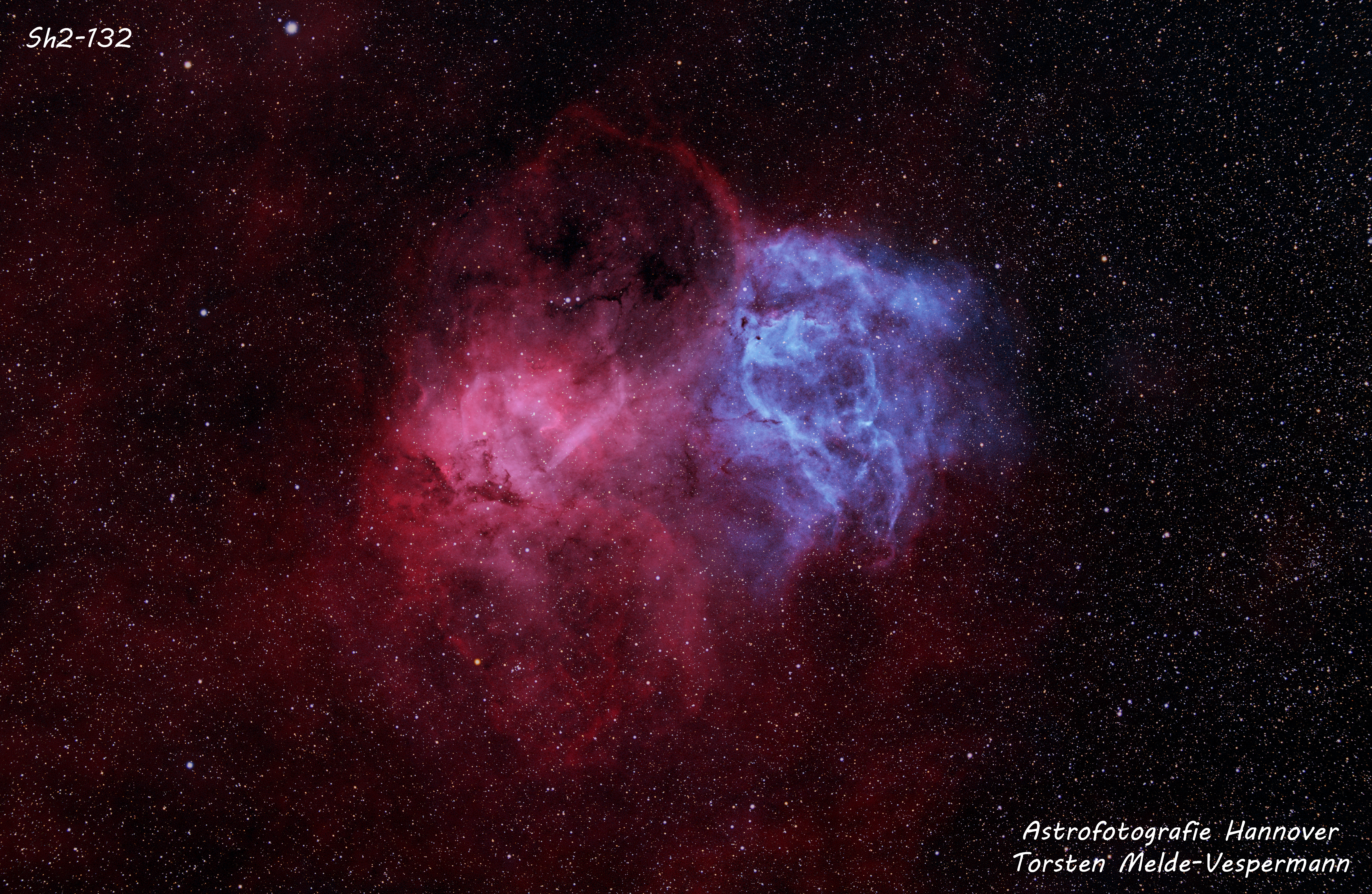 SH2-132, auch bekannt als Sharpless 2-132, ist ein faszinierendes Emissionsnebelgebiet im Sternbild Kepheus. Dieser Nebel, der sich in einer Entfernung von etwa 5.200 Lichtjahren von der Erde befindet, erstrahlt in den Tiefen des Weltraums und begeistert Astronomen und Hobbybeobachter gleichermaßen. SH2-132 zeichnet sich durch seine auffällige rote Farbe aus, die von ionisiertem Wasserstoff verursacht wird. Inmitten dieses leuchtenden Nebels befinden sich junge, heiße Sterne, die ihre energiereiche Strahlung in den Raum abgeben und den Nebel zum Leuchten bringen. Die Form des Nebels erinnert an einen Drachen, der sich über den Himmel erstreckt, und seine konturierenden Dunkelwolken verleihen ihm eine geheimnisvolle und majestätische Erscheinung. Dieser Nebel ist ein wahrer Schatz für die Astronomie, da er Einblicke in die Geburt und Entwicklung von Sternen ermöglicht. Forscher nutzen Teleskope und spektroskopische Analysen, um die Prozesse der Sternentstehung in SH2-132 zu erforschen und unser Verständnis des Universums zu vertiefen. SH2-132 ist nicht nur ein faszinierendes Objekt der Astronomie, sondern auch eine Quelle der Inspiration und des Staunens für Menschen auf der ganzen Welt, die sich in klaren Nächten dem Himmel zuwenden, um diese spektakuläre Region des Weltraums zu betrachten.