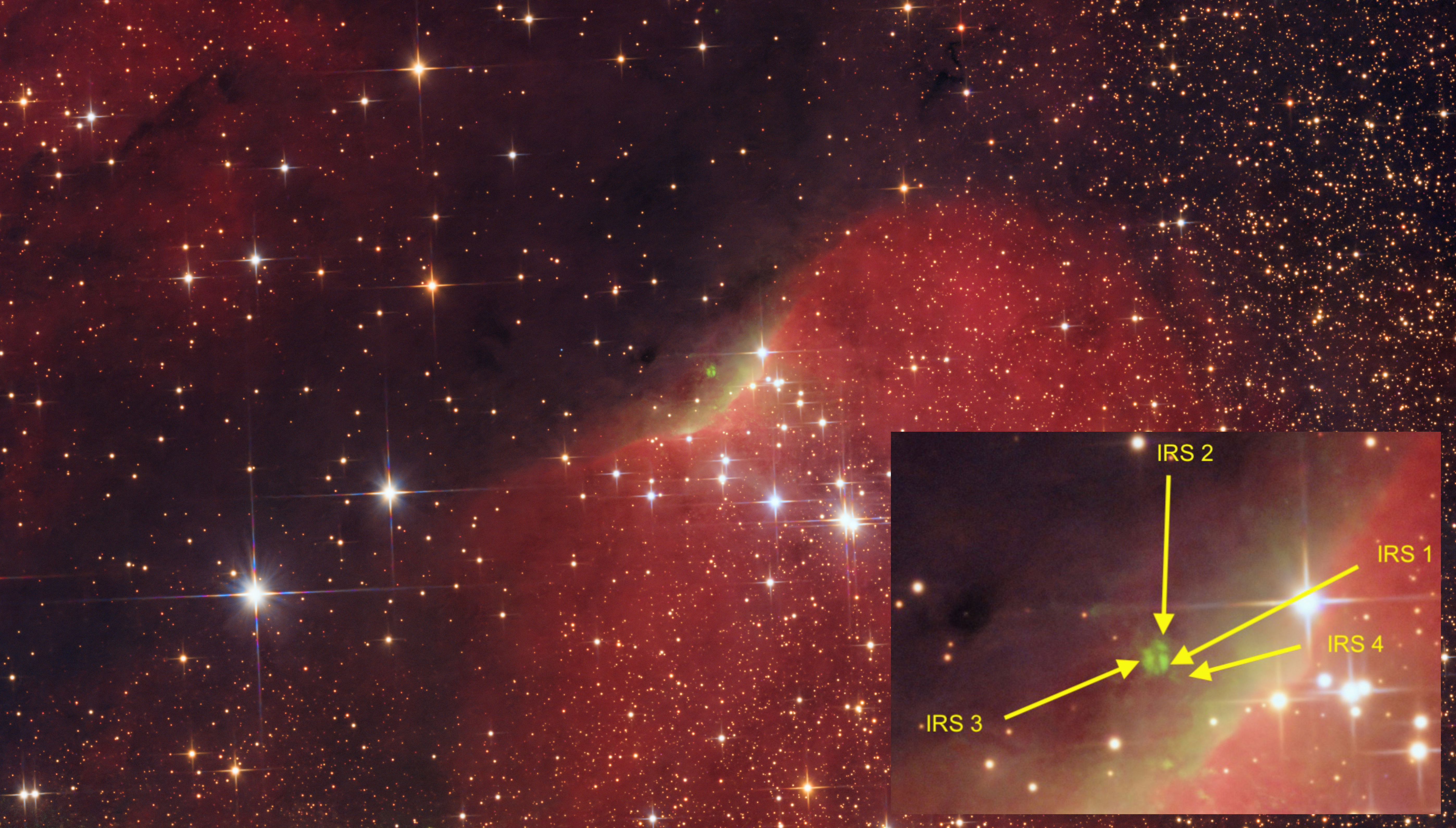 Das abgebildete Objekt ist SH2-140, das hauptsächlich H-alpha-Komponenten aufweist. Im Nahinfrarotbereich ist jedoch der unsichtbare Haufen SH 2-140 IRS 1–4 auf dem Bild zu sehen. Ich habe die NIR-Aufnahme in grün eingebunden und als Vergrößerung mit Beschriftung eingefügt.