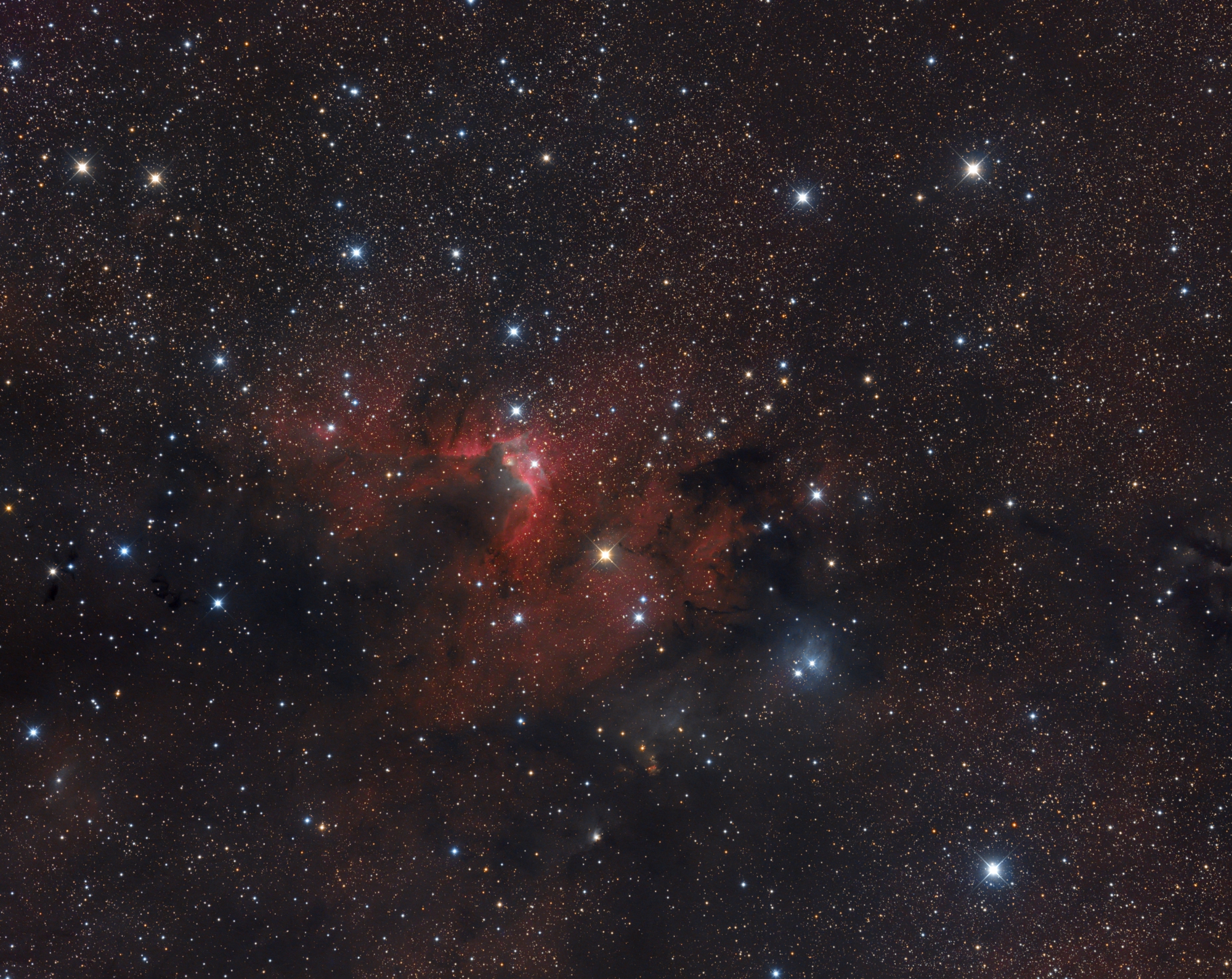 Sh2-155 ist ein diffuser Nebel im Sternbild Kepheus, innerhalb eines größeren Nebelkomplexes, der Emissions-, Reflexions und Dunkelnebel enthält. Er ist weithin als Höhlennebel bekannt, obwohl dieser Name früher auf Ced 201, einen anderen Nebel in Cepheus, angewendet wurde. Sh2-155 ist eine ionisierte HII-Region mit Sternentstehungsaktivität in einer geschätzten Entfernung von 2400 Lichtjahren von der Erde. Dieser Nebelkomplex ist wie ich finde farblich sehr reizvoll, strukturell jedoch uninteressant weil scharfe Grenzen kaum vorhanden sind.