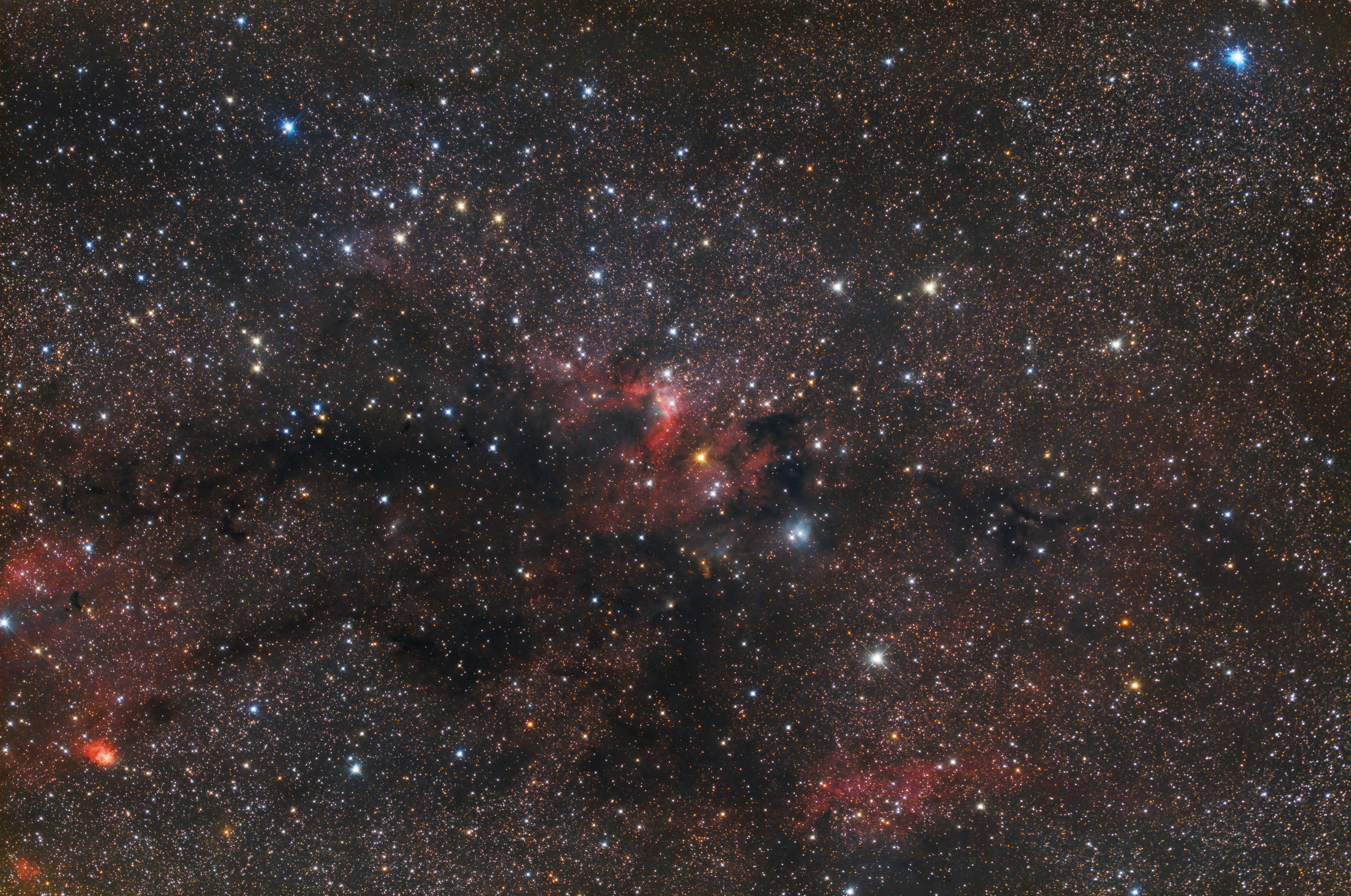 Sharpless-155 (Caldwell 9 oder CAVE Nebula) ist ein diffuser Nebel innerhalb eines größeren Nebelkomplexes mit sowohl Emissions- und Reflexionsnebeln, als auch mit Dunkelnebeln.