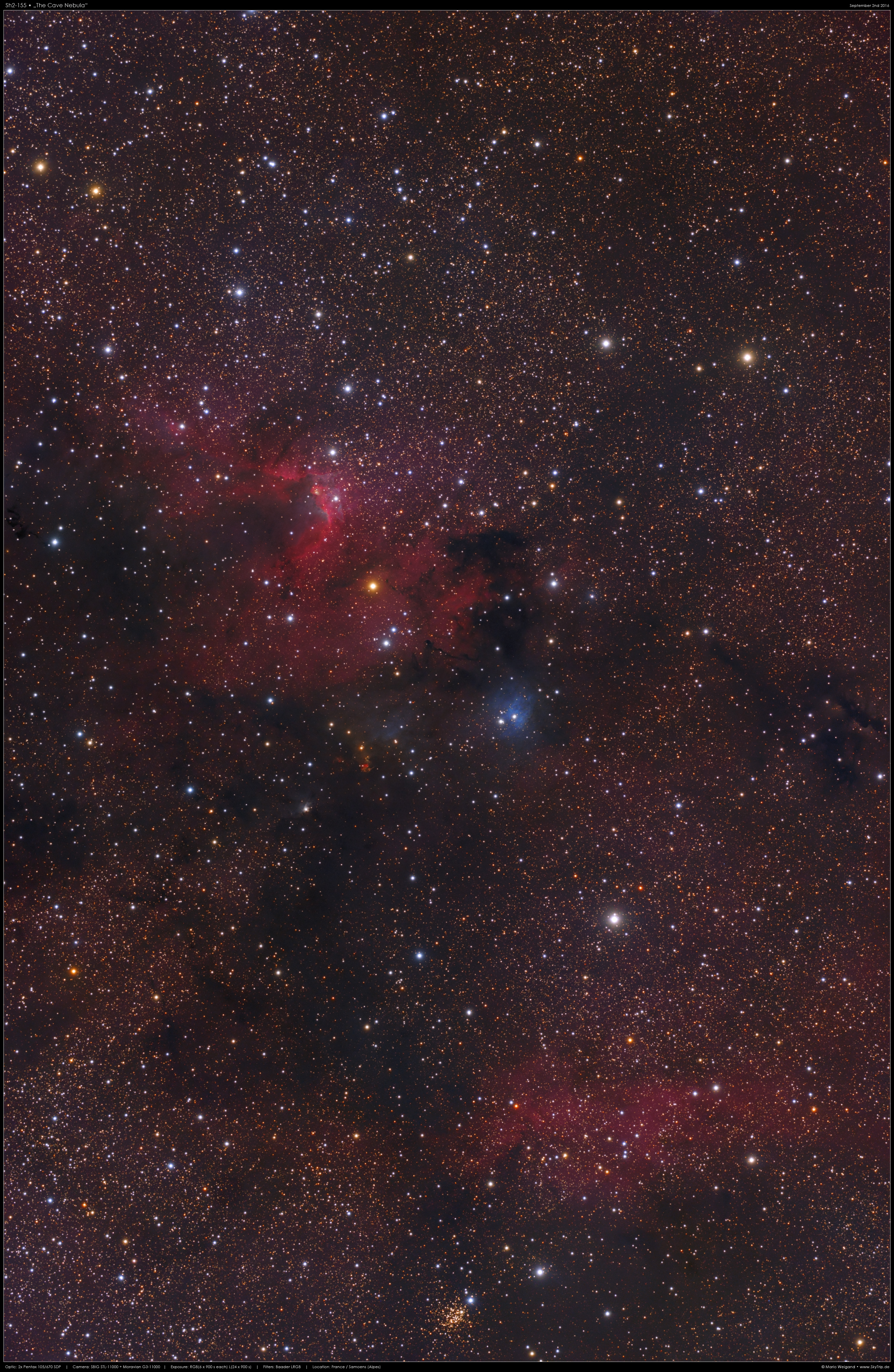 Der auch als "Cave Nebula" bezeichnete Nebel Sh2-155 ist eine spannende Kombination aus Reflexion, Emission und Dunkelwolken im Sternbild Cepheus in rund 2400 Lichtjahren Entfernung. Deutlich sind interessant geformte Photodissoziationsregionen zu erkennen, die plastisch wirkende Fronten bilden, wie man sie zum Beispiel auch vom Adlernebel kennt. Südwestlich des Cave Nebel liegt ein blauer Reflexionsnebel, der als VdB 155 katalogisiert ist. Am unteren Bildrand ist zudem der offene Sternhaufen NGC 7419 zu sehen, dessen Sternlicht durch Staub auf der Sichtlinie stark gerötet ist.