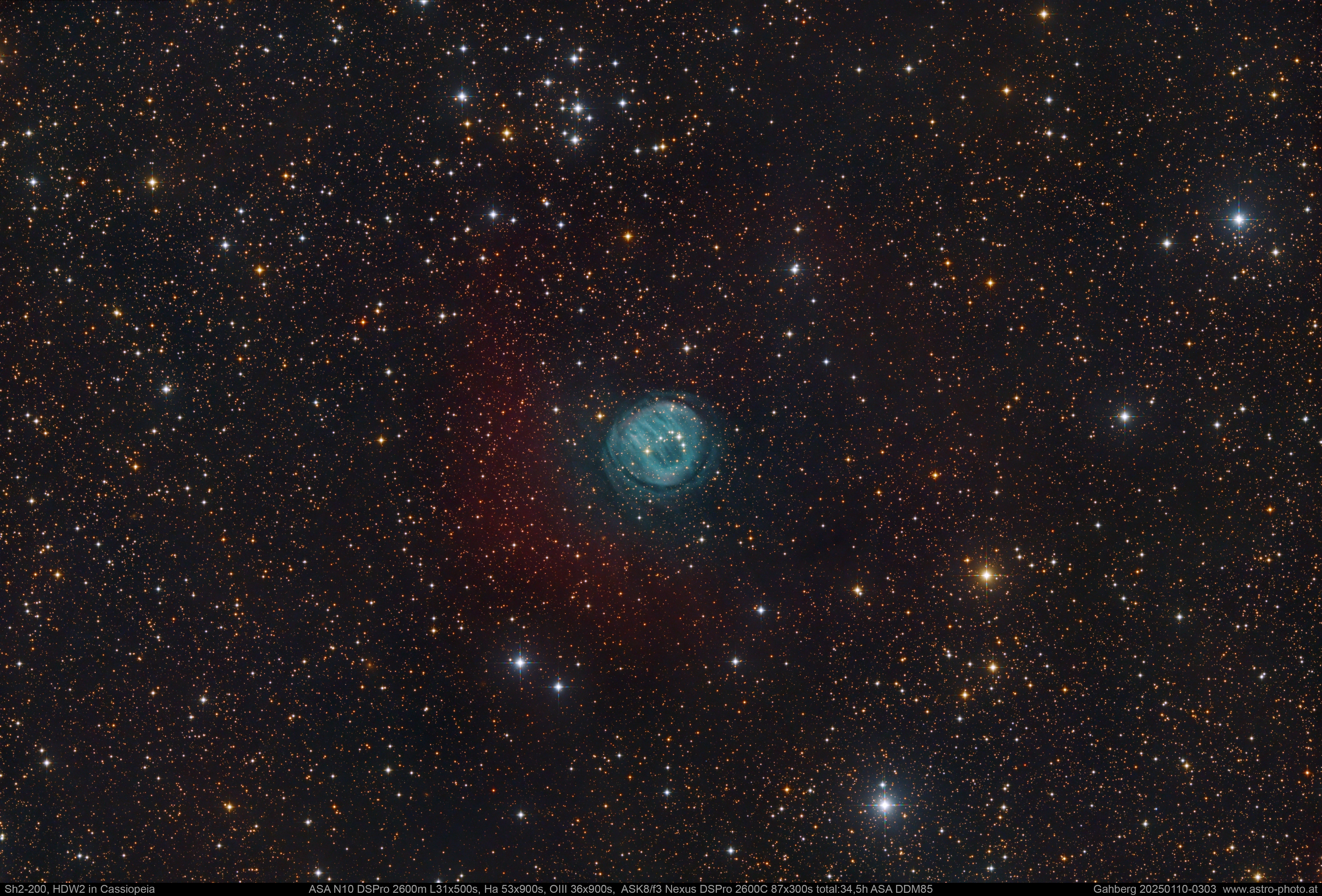 | Belichtungszeit | L 31 x 500s, H-alpha 53 x 900s, OIII 36 x 900s, C 87 x 300s total: 34,5h |