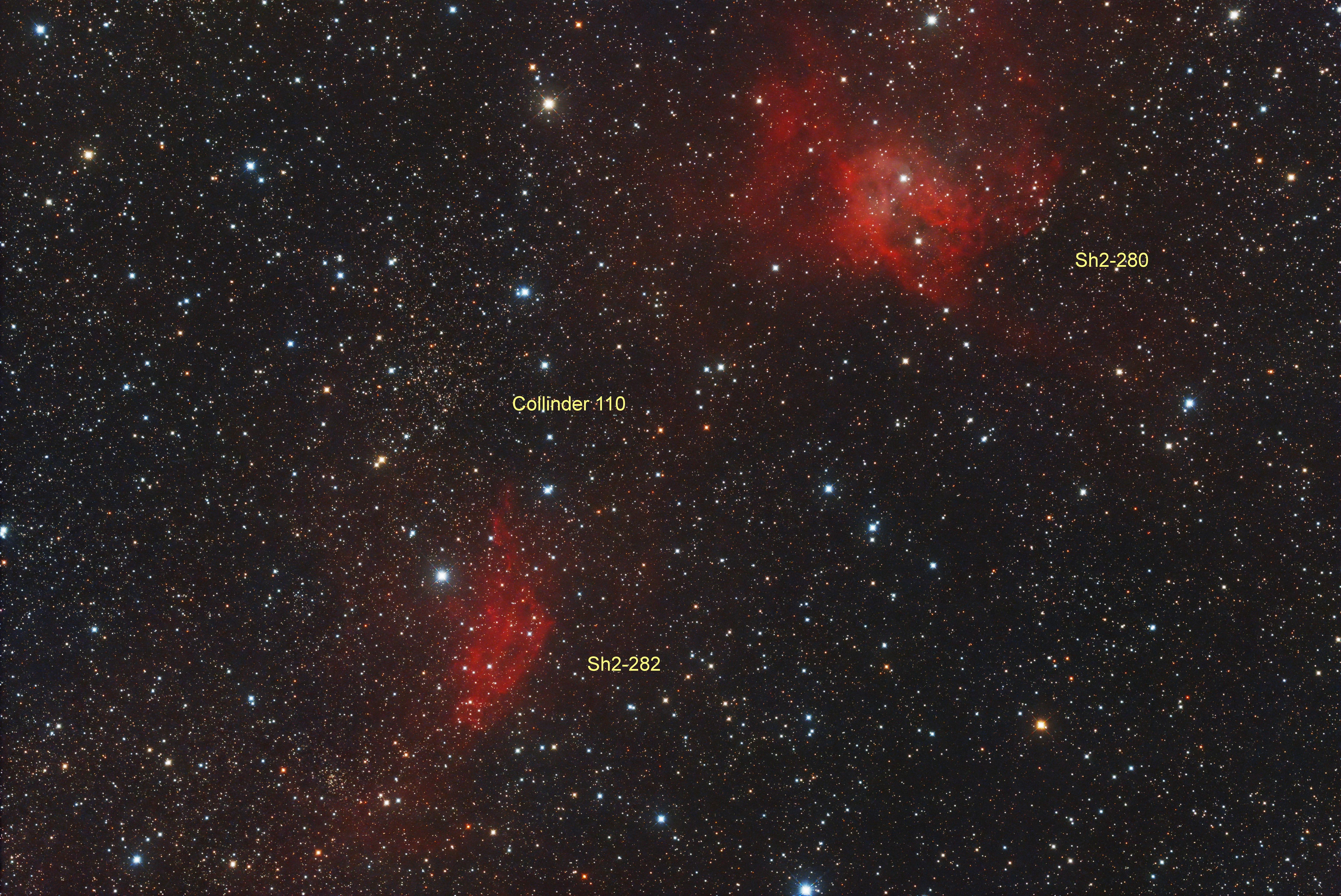 Im Sternbild Einhorn (Monoceros) gibt es einige Nebel und Sternhaufen, der bekannteste ist natürlich der berühmte Rosettennebel. Rund 2,5 Grad südlich trifft man auf den deutlich schwächeren Emissionsnebel Sh2-280, wie der Rosettennebel ein Teil derselben Molekülwolke. Das rote Leuchten des Nebels hat wahrscheinlich in der ionisierenden UV-Strahlung des O7-Sterns HD 46573 seinen Ursprung. Es ist der auffälligste Stern vor dem hellsten Bereich des Nebels. Noch einmal etwa 1,3 Grad in südöstlicher Richtung liegt ein weiterer zum Leuchten angeregter Teil der Molekülwolke, Sh2-282. Es ist ein noch schwächerer Nebel, der vom O9.5-Riesenstern HD 47432 angeregt wird - einer der hellsten Sterne im Bild. Neben all den Nebeln finden sich im Bildfeld auch einige offene Sternhaufen. Am auffälligsten ist Collinder 110 links der Bildmitte, ein älterer Sternhaufen in 1950 pc Entfernung.