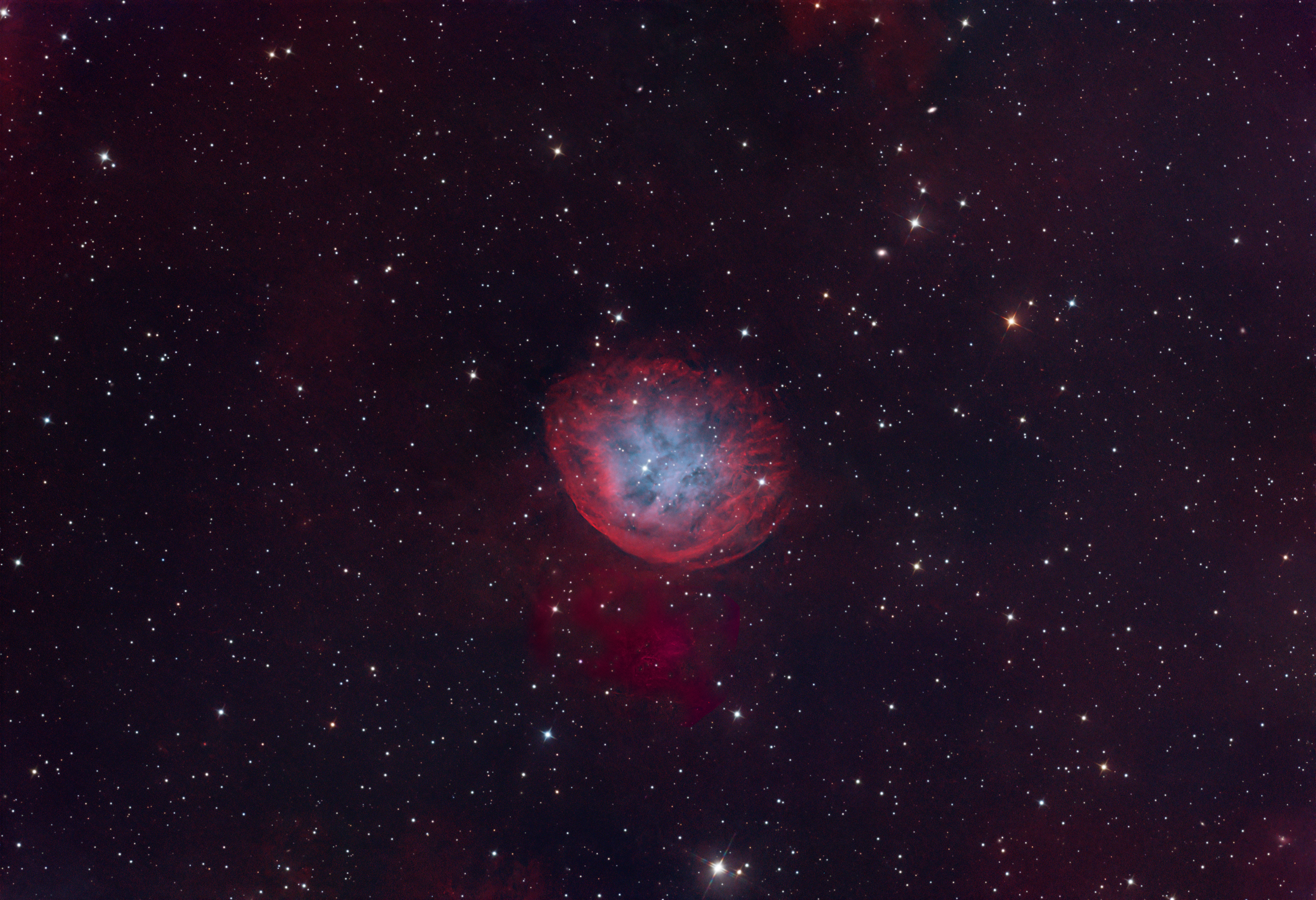 Sh2-290 oder auch Abell 31 ist einer der visuell größten Planetarischen Nebel am Himmel, dennoch wird er nicht sehr häufig fotografiert. Auch hat er keinen gängigen Eigennamen. Er befindet sich im Sternbild Krebs in ungefähr 1770 Lichtjahren Entfernung. Fotografisch stellt er eine Herausforderung dar, denn gerade das blaue Zentrum strahlt hell in O3, das vornehmlich in mondlosen Nächten aufgenommen werden sollte. Dies war mir tatsächlich im März / April vergönnt.