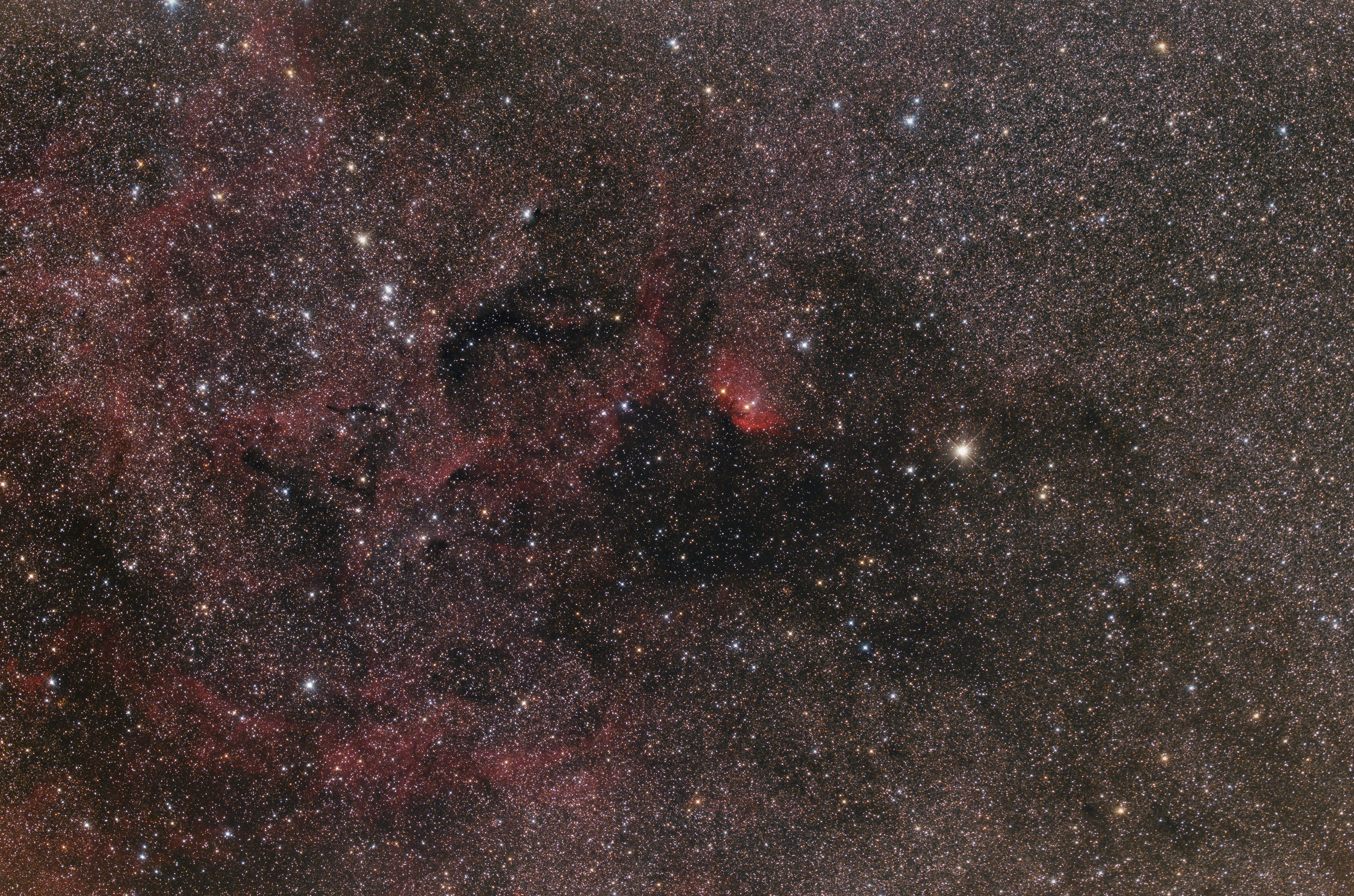 Am 6. November 2020 habe ich mit Epsilon 130 ED APO und Canon EOS 6DA diese Gegend im Schwan 123 Minuten (3min Subframes bei ISO 1600) belichtet. Sharpless 101 ist ein Emissionsnebel der HII-Region, deren zentrales Objekt manchmal auch Tulpennebel genannt wird. Es liegt etwa 6000 Lichtjahre von uns entfernt.