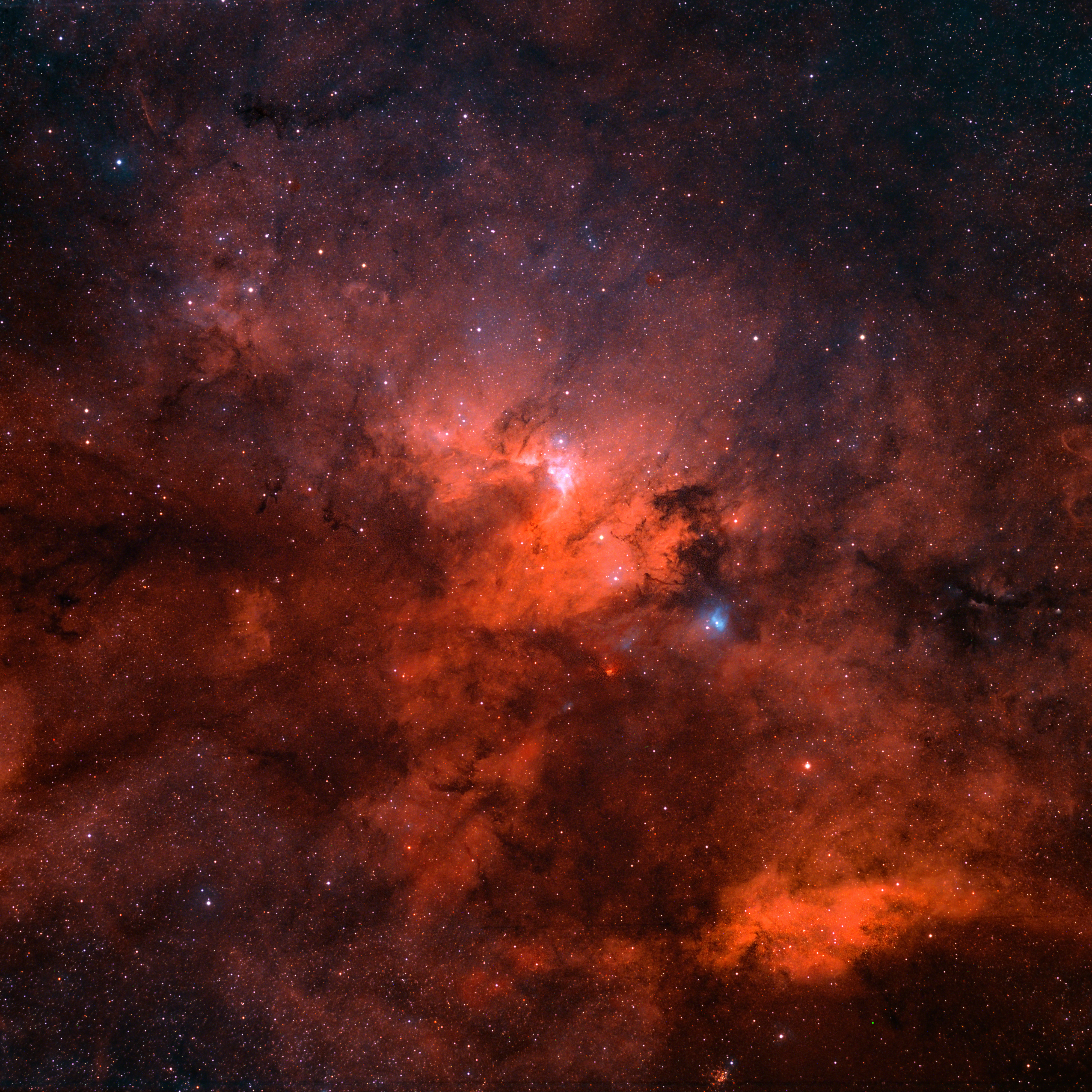 Diese Aufnahme zeigt Sharpless 155, auch bekannt unter dem Namen "Cave-Nebel" bzw. "Höhlennebel." Sh2-155 ist ein relativ lichtschwacher Nebelkomplex im Sternbild Kepheus. Dieser Nebel setzt sich aus Emissionsnebeln, Reflexionsnebeln sowie Dunkelwolken zusammen.