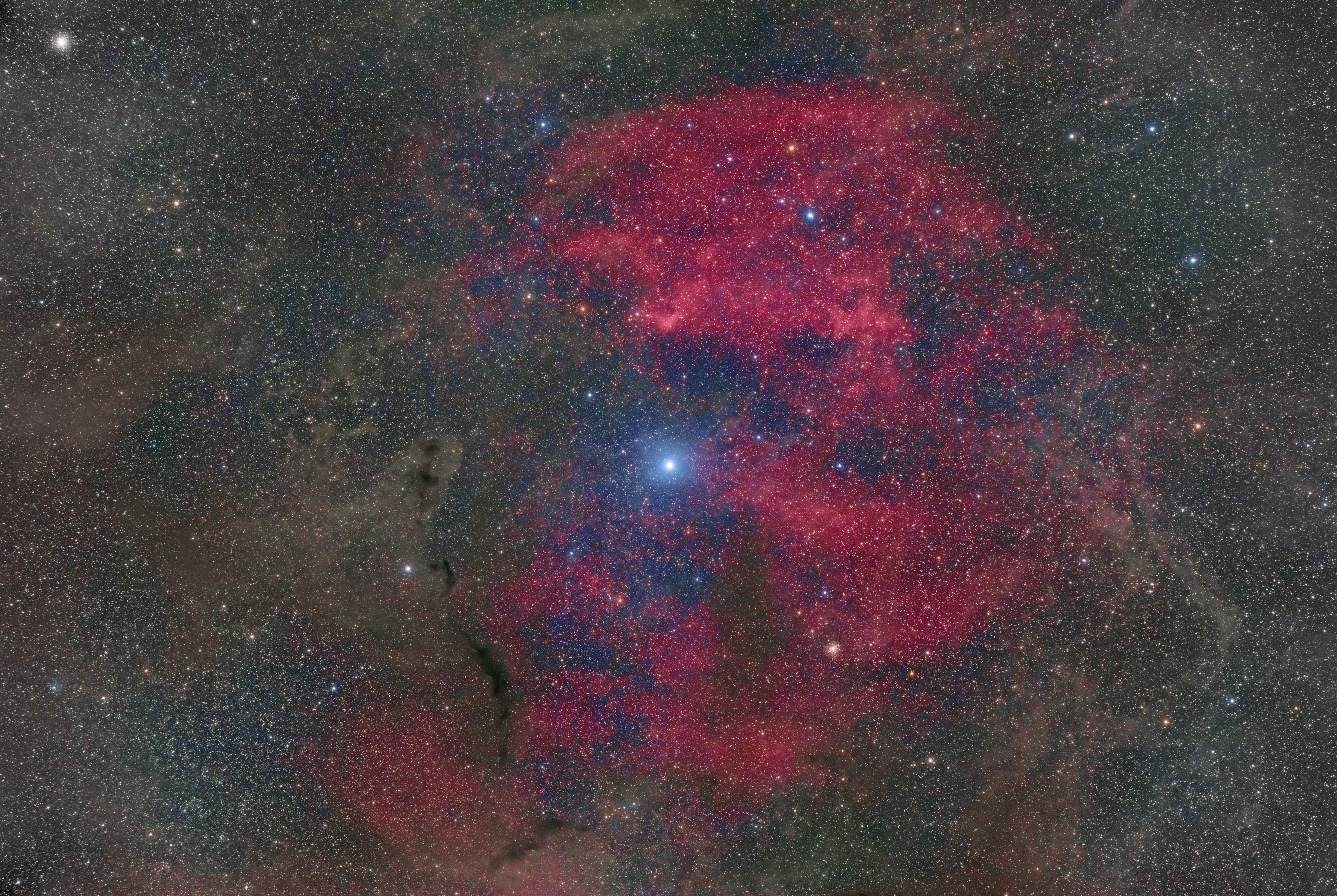 Etwas hellere Neubearbeitung: Nördlich des Sternbilds Skorpion befindet sich der riesige, jedoch sehr lichtschwache Emissionsnebel Sharpless 2-27. Diese rote HII-Wolke hat eine scheinbare Ausdehnung von zehn Grad, das entspricht etwa 20 Monddurchmessern! Für das menschliche Auge ist er jedoch nicht sichtbar; erst tief belichtete Aufnahmen lassen ihn hervortreten. Genau in der Mitte befindet sich Zeta Ophiuchi, ein heller Stern der Spektralklasse O9 V und Teil des Sternbilds Schlangeträger. Dieser wurde vermutlich durch die Supernova seines Doppelsternpartners fortgeschleudert und rast nun mit etwa 30 km/s als so genannter Schnellläufer durchs All. Am Bild sieht man zudem noch die beiden Kugelsternhaufen Messier 10 (obere linke Ecke) und Messier 107 (halb unten rechts). Die Aufnahme entstand während vier Nächten im April, Mai und Juni 2020 und vereint 160 Bilder zu je zwei Minuten Belichtungszeit.