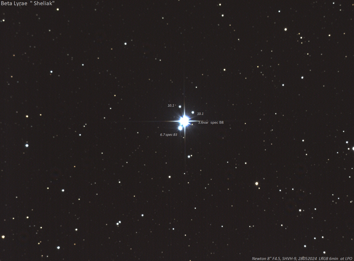 Auf den ersten Blick erscheint der südwestliche Stern im Sternparallelogramm der Leier als schöner visueller Doppelstern fürs kleine Fernrohr. Sein Abstand beträgt 45 Bogensekunden. Dieser Begleiter scheint physisch zu Beta Lyrae zu gehören wobei die Umlaufzeit unbekannt ist. Im Jahre 1784 entdeckte der britische Amateurastronom John Goodricke die Veränderlichkeit von Beta Lyrae, kurz nachdem er zuvor erfolgreich die Lichtkurve von Algol (entdeckt 1669 von Geminiano Montanari in Bologna) erklären konnte. Seit dieser Zeit spielte der Stern mit den Astronomen Katz und Maus und scheint bis heute seine Geheimnisse nicht vollständig preisgegeben zu haben. 1891 entdeckte Williamina P. Fleming im Rahmen der Harvard-Klassifikation auf Spektren des Sterns das Erscheinen einer Verdoppelung von Spektrallinien. Damit stellte sich Sheliak als spektroskopischer Doppelstern vor. Ihre Kollegin Antonia C.Maury begann sich hierauf intensiv mit der Erstellung einer exakten Lichtkurve und dem Versuch einer Erklärung dieser zu beschäftigen. 1889 hatte Miss Maury Mizar A als ersten spektroskopischen Doppelstern überhaupt entdeckt! Die Lichtkurve war von Anfang an rätselhaft. Die Periode beträgt 12,9 Tage, wobei Minima und Maxima sich kontinuierlich verändern. Die Amplitude beträgt zwischen 0,8 bis 1,1 mag. Das Nebenminimum ist 0,3 mag schwächer als die Maximalhelligkeit. Der Hauptstern vom Spektraltyp B7Ve hat 8 Sonnenmassen, der Begleiter Spec A8p sogar 12,5 Sonnenmassen. Aufgrund ihres sehr engen Abstands werden beide Sterne durch ihre starke Anziehungskraft rotationselliptisch verformt, so dass sich dem normalen Bedeckungslichtwechsel ein Rotationslichtwechsel der Komponenten überlagert. Weiters kommt es zu einem Massentransfer von jährlich einer zehntausendstel Sonnenmasse. Eine Akkretionsscheibe und das Auftreten von Jets führt zu Emissionslinien im Spektrum. Beta Lyrae ist 960 Lichtjahre entfernt. Im Jahre 2008 konnten die beiden Komponenten mittels des CHIARA Interferometers am Mt.Wilson Observatorium sichtbar gemacht werden (getrennt). Mit freiem Auge bereits lassen sich Minimum (4,2 mag) und Maximum (3,4 mag) durch Vergleich mit Gamma Lyrae zwei Grad westlich, 3,2 mag, schön erkennen!