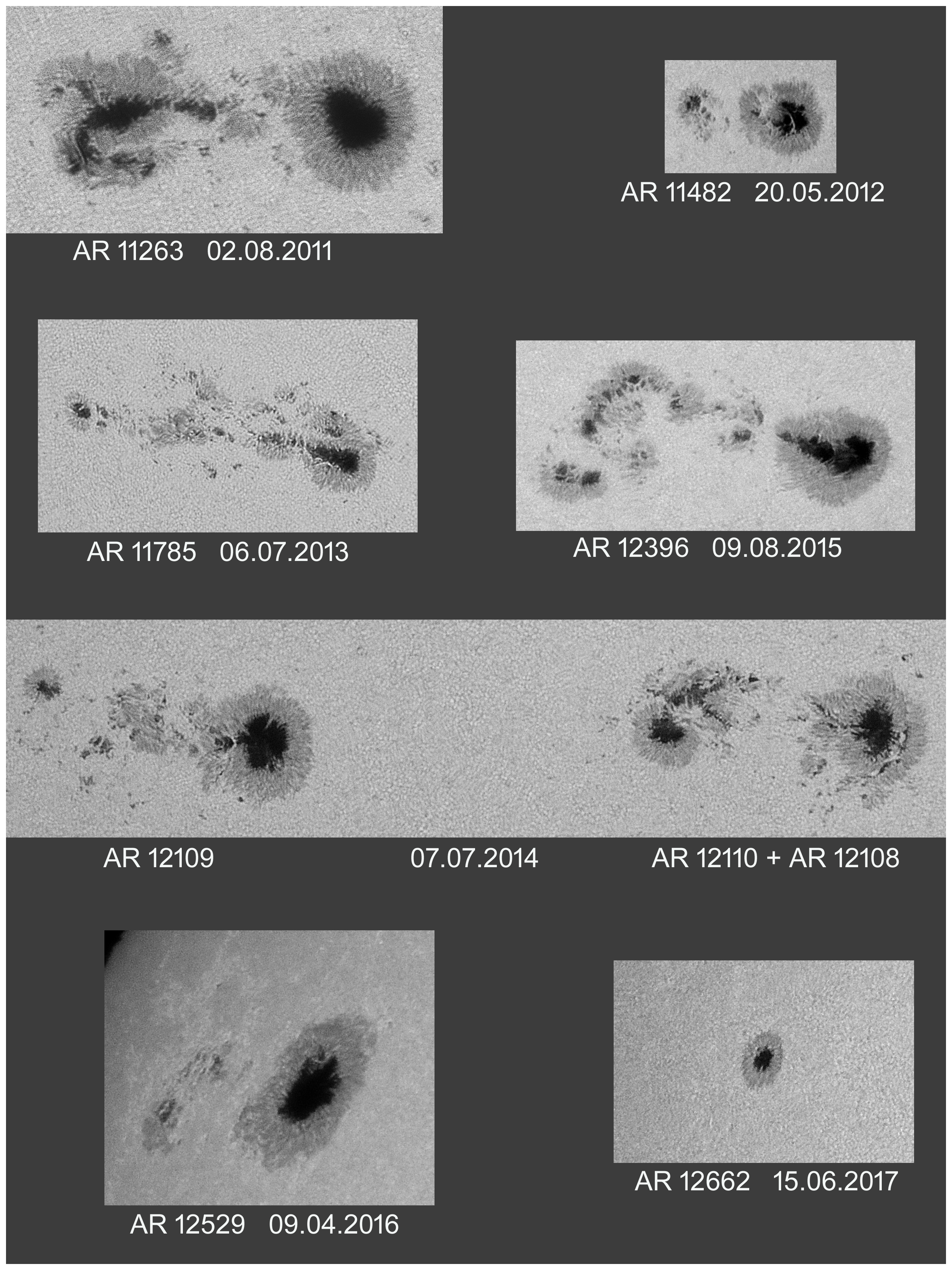 Nun geht der 24. Sonnenzyklus so langsam zu Ende. Rückblickend gab es viele schöne, abwechslungsreiche und vor allem auch große Sonnenflecken zu sehen. Auf diesem Foto habe ich eine Auswahl meiner schönsten Bilder aus sieben Jahren Sonnenbeobachtung zusammengestellt.