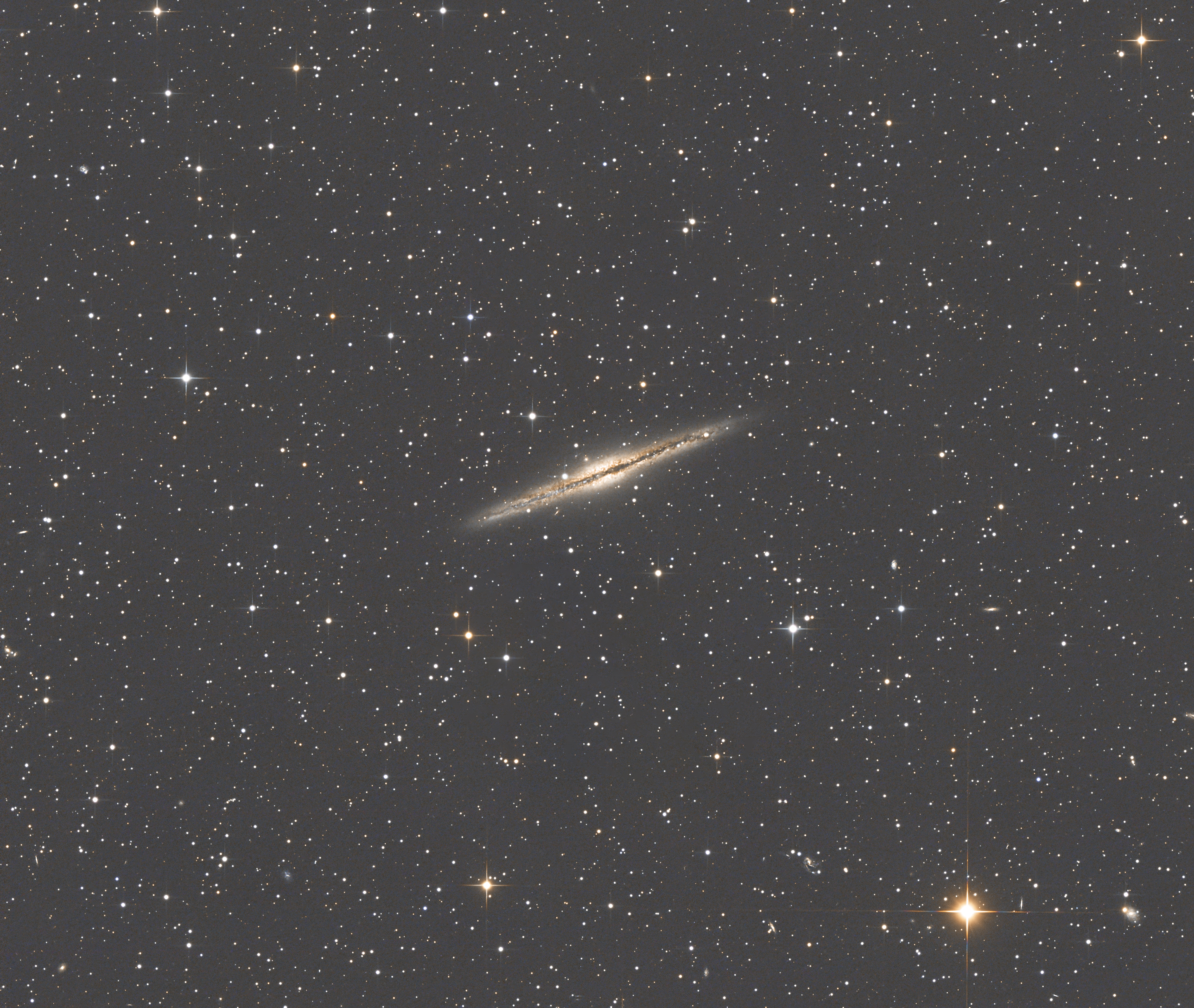 Die Silbersplitter-Galaxie NGC 891 ist eine Spiralgalaxie im Sternbild Andromeda. Sie ist 30 Millionen Lichtjahre von uns entfernt und nur von der Seite her zu betrachten (Edge-on-Galaxy). Belichtungsdauer insgesamt 6 Stunden in der Nacht zum 30. November 2024. Aufgenommen mit Astrocamera ZWOAsi 533 MC Pro und 8-Zoll-Newton-Teleskop. Nachgeführt mit Celestron AVX, Guiding mit PHD2.