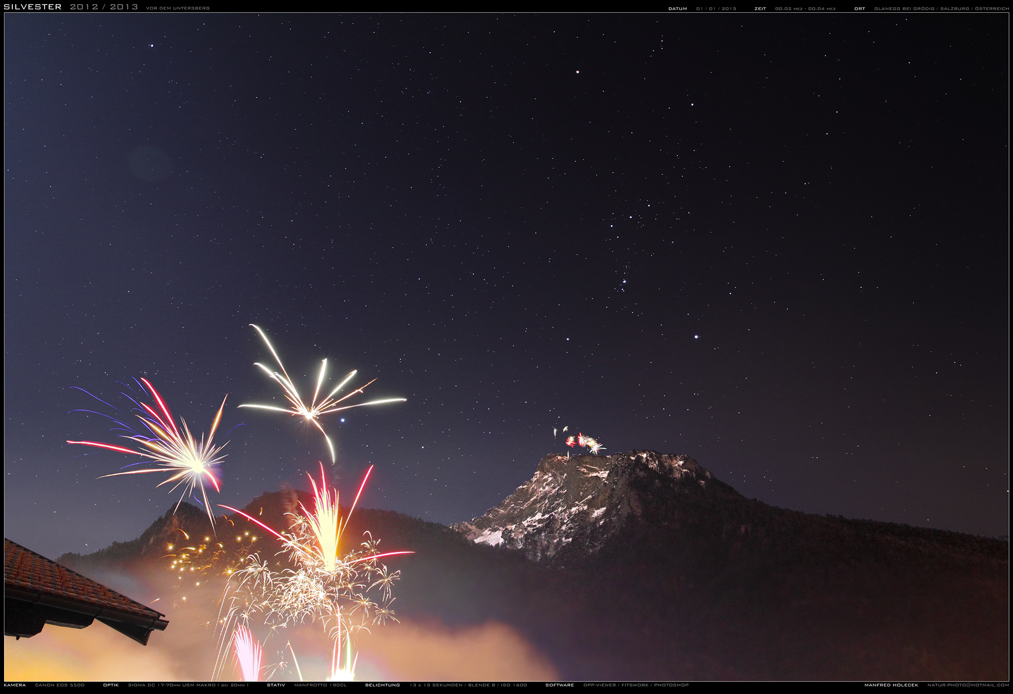 Anfang 2013 war das Wetter zu Silvester in Salzburg erstmals günstig, um ein seit langem geplantes Foto zu verwirklichen. Mein Wunsch, ein Feuerwerk vor dem Sternenhimmel fotografieren zu können, ging Anfang 2013 endlich in Erfüllung.