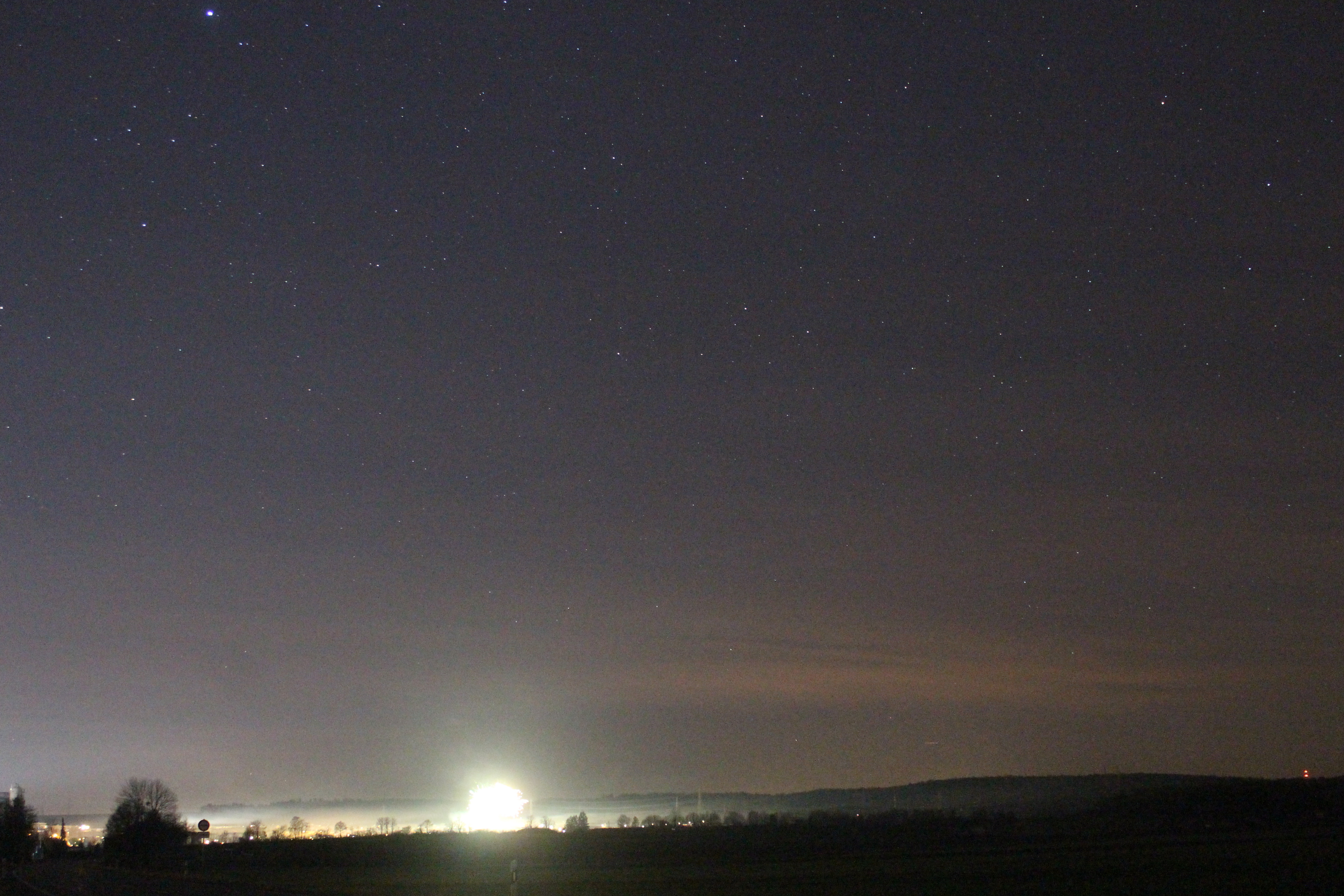 Trotz des Verkaufsverbots für pyrotechnische Gegenständer der Klasse 2 gab es zum Jahreswechsel 2021/2022 ein recht passables Feuerwerk. Da der Himmel einigermaßen klar war, waren zum Jahreswechsel auch Sterne sichtbar. Auf diesem Bild sieht man eine Feuerwerksrakete, welche über dem zum Teil in Bodennebel gehüllten Sindelfinger Ortsteil Darmsheim explodiert während man am linken Bildrand die westlichen Sterne des Hasen und Rigel im Orion (heller Stern unterhalb des oberen Randes) sehen kann. Die Sterne im rechten Teil des Bildes gehören zum Eridanus.