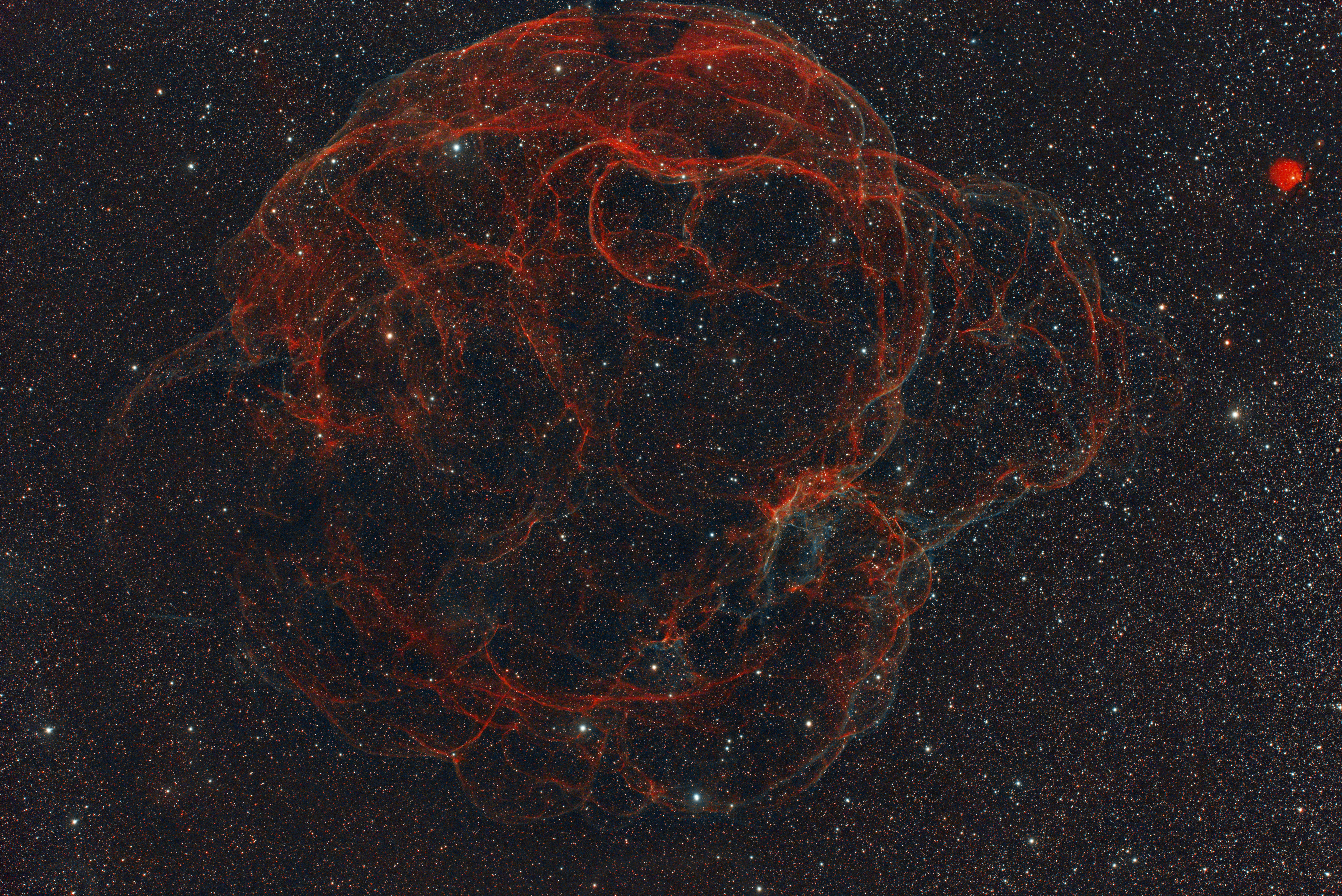 Zwei Wochen, sechs wechselhafte Nächte und ein Dualbandfilter waren nötig, um insgesamt 13h 20min Belichtungszeit zu summieren. Sh2-240 (Simeis 147) ist ein Supernova-Überrest, der zusätzlich auch noch einen Pulsar beinhaltet. Der Durchmesser beträgt 150 Lichtjahre und die Entfernung ist etwa 3000 Lichtjahre.