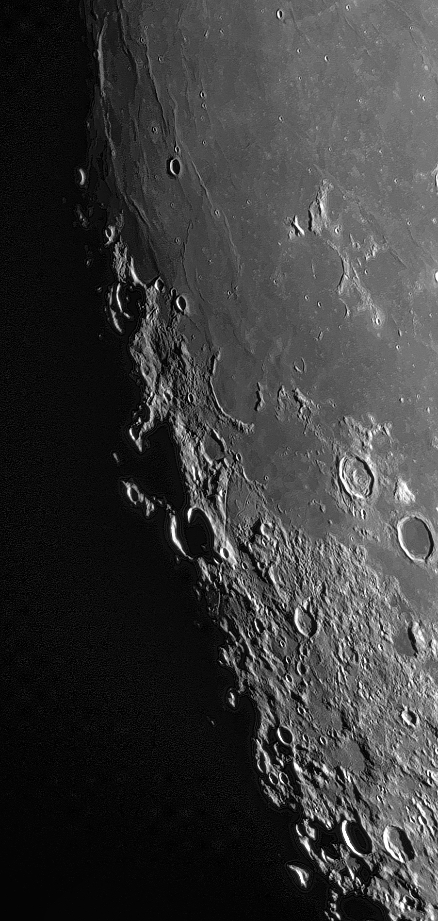 Der Doppelkrater Sirsalis/Sirsalis A schält sich aus dem Dunkel der Mondnacht. Er wird gestreift von der auffälligen Rima Sirsalis, deren eine Hälfte noch ganz im Dunkeln liegt. Hansteen und Billy sind am Kratergrund mit vielen kleinen Rillen geschmückt. Zwischen Hamsteen und Billy der 1000 m hohe Mons Hansteen.