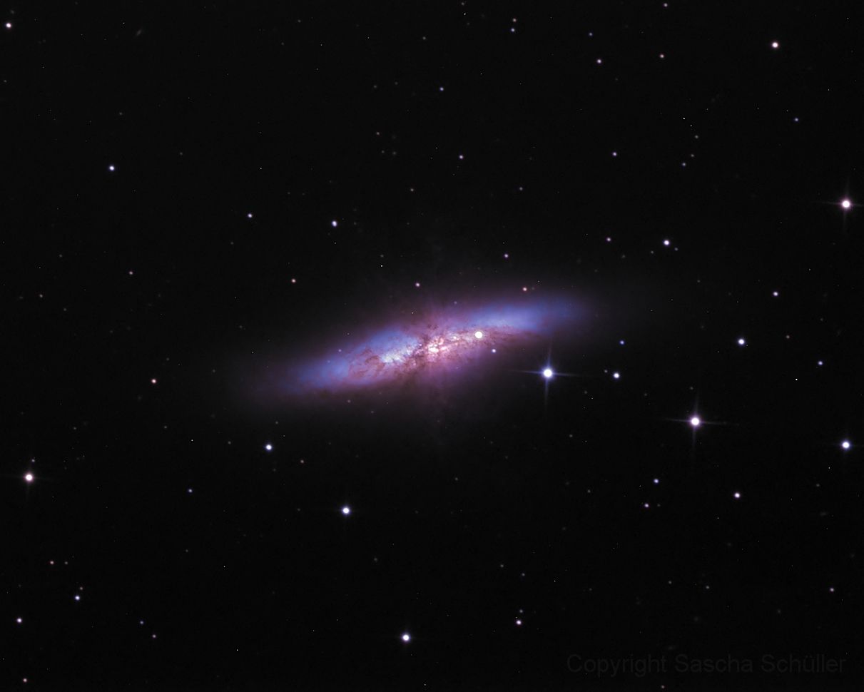 Das Bild zeigt das spektakuläre Ereignis der Supernova SN 2014J in M 82. Die Helligkeit wurde auf 10.3mag bestimmt, die Farbe scheint leicht ins Rote verschoben zu sein. Das Bild entstand aus ca.25 Einzelbildern pro Kanal mit jeweils 3 min Belichtungszeit.