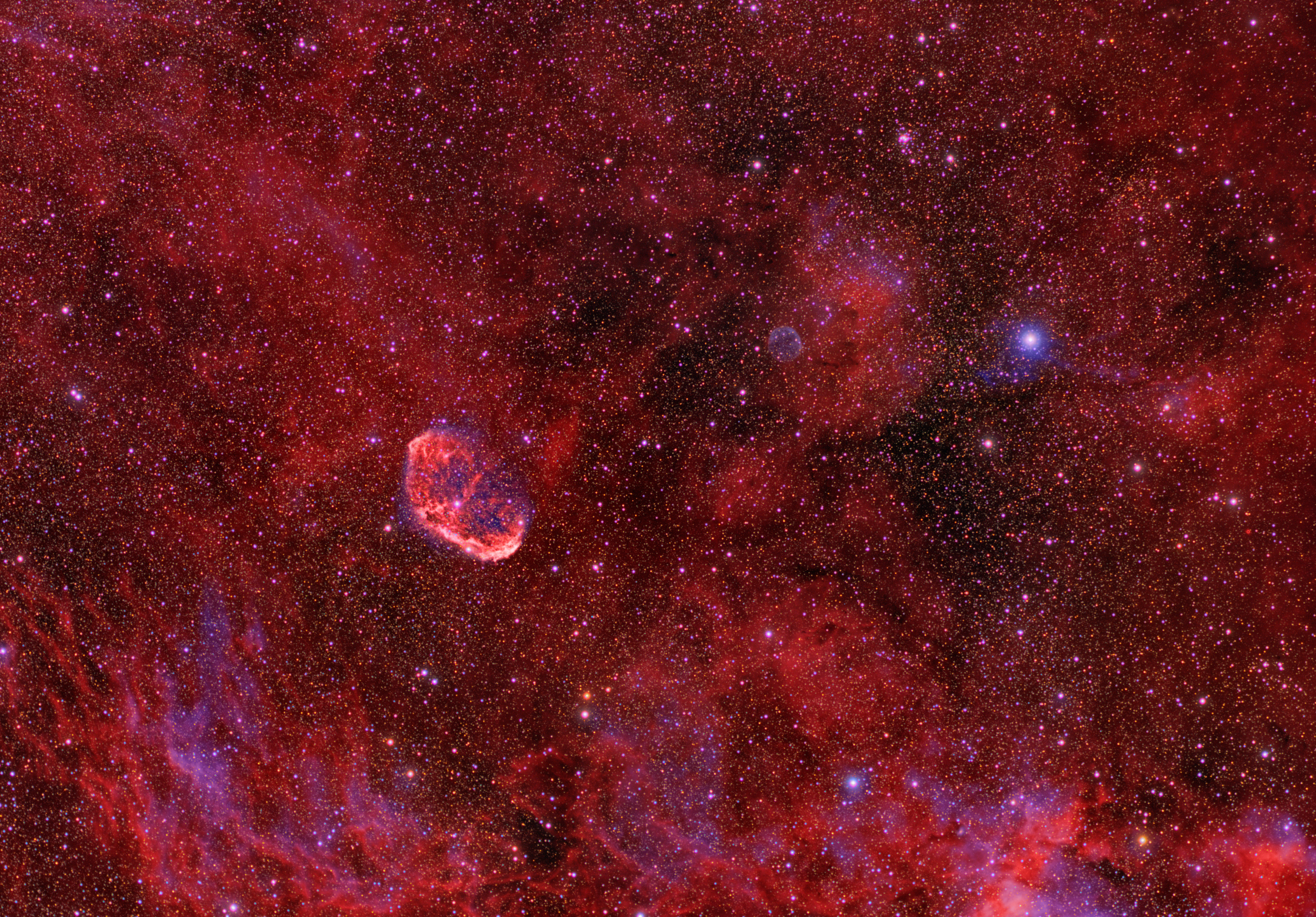 Ein Hauch von OIII vor der riesigen HII-Region! Dementsprechend lange brauchte auch das Bearbeiten des Bilds. Hier eine Auflistung der Belichtungszeiten: