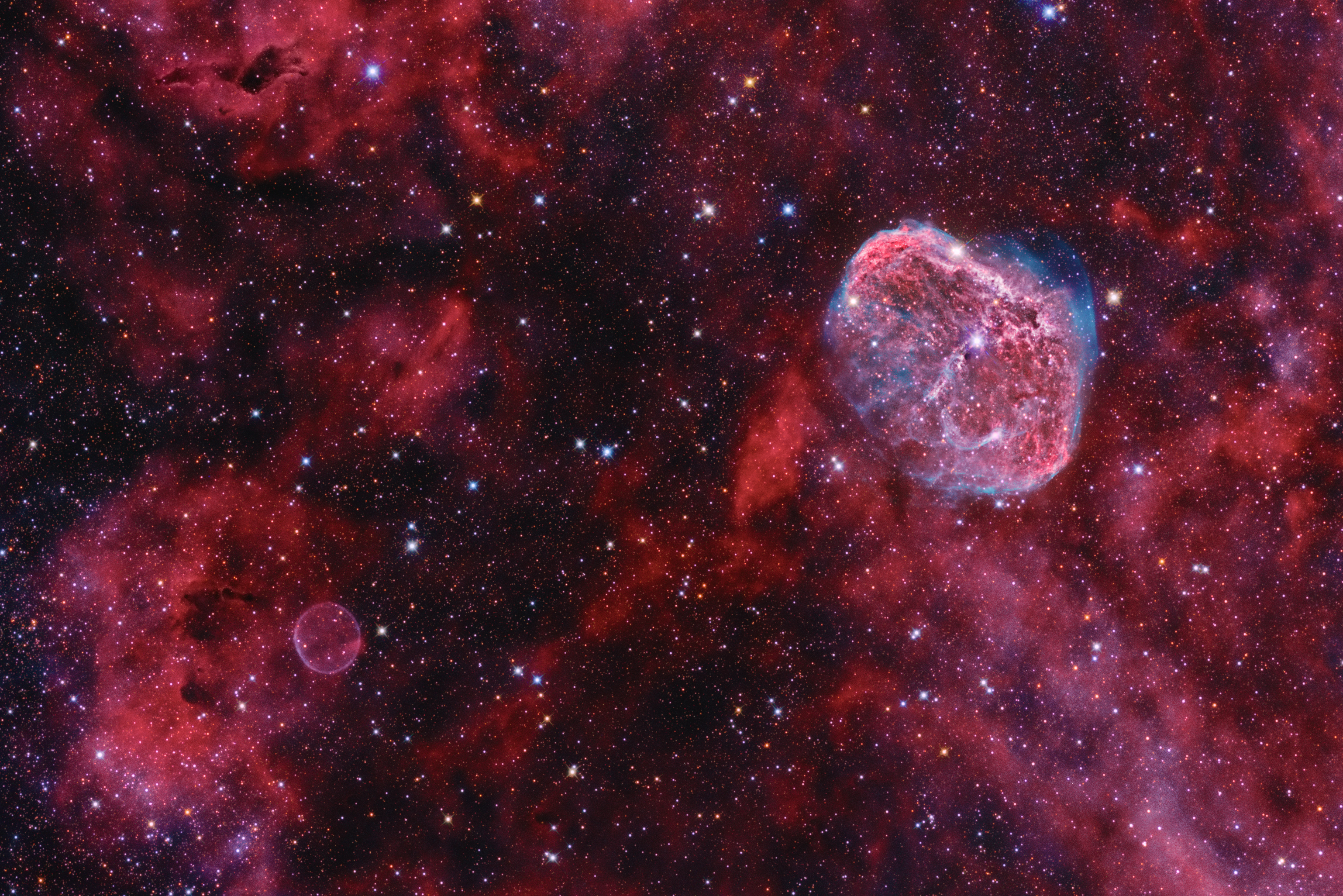 Soap Bubble planetary nebula is located less than one degree from the famous Crescent Nebula. It was discovered only a few years ago. This is a composit image taken with two telescopes. Nebula was recorded with my self built 200/710-mm-Astrograph, QSI683 CCD, Ha-OIII-filters. Stars were recorded with EOS 5DmkII and 300/1130 Newtonian.