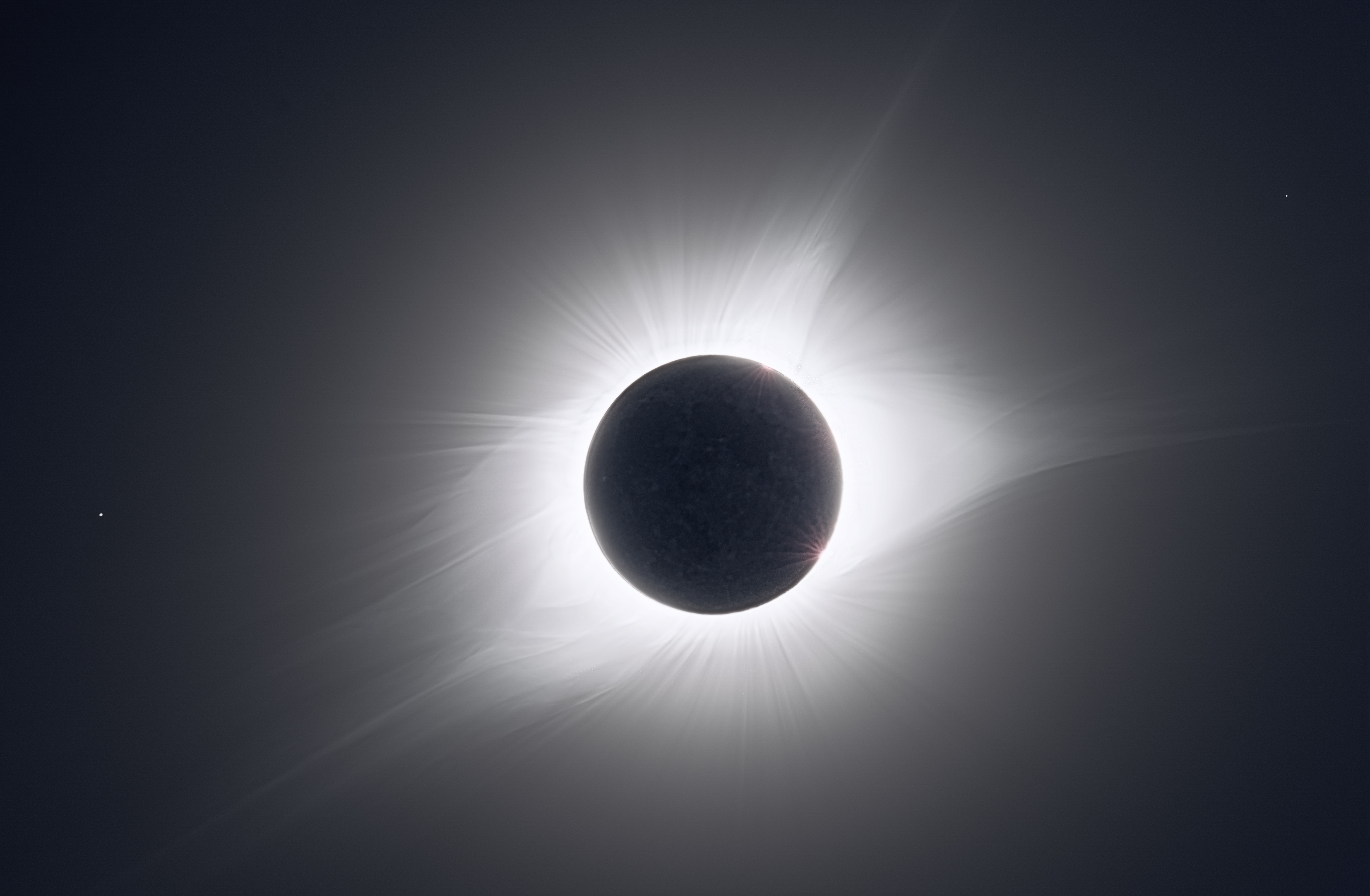 Vermutlich ist es vergeblich, den erlebten visuellen Eindruck korrekt auf ein Bild bringen zu wollen. Und so habe ich versucht, sowohl Mondoberfläche als auch Korona-Strahlen gut sichtbar zu machen, ohne dabei zu übertreiben. Während der Totalität konnte ich 60 Einzelbilder zwischen 1/400 s und 1 s aufnehmen. Diese habe ich entsprechend überlagert und verarbeitet.