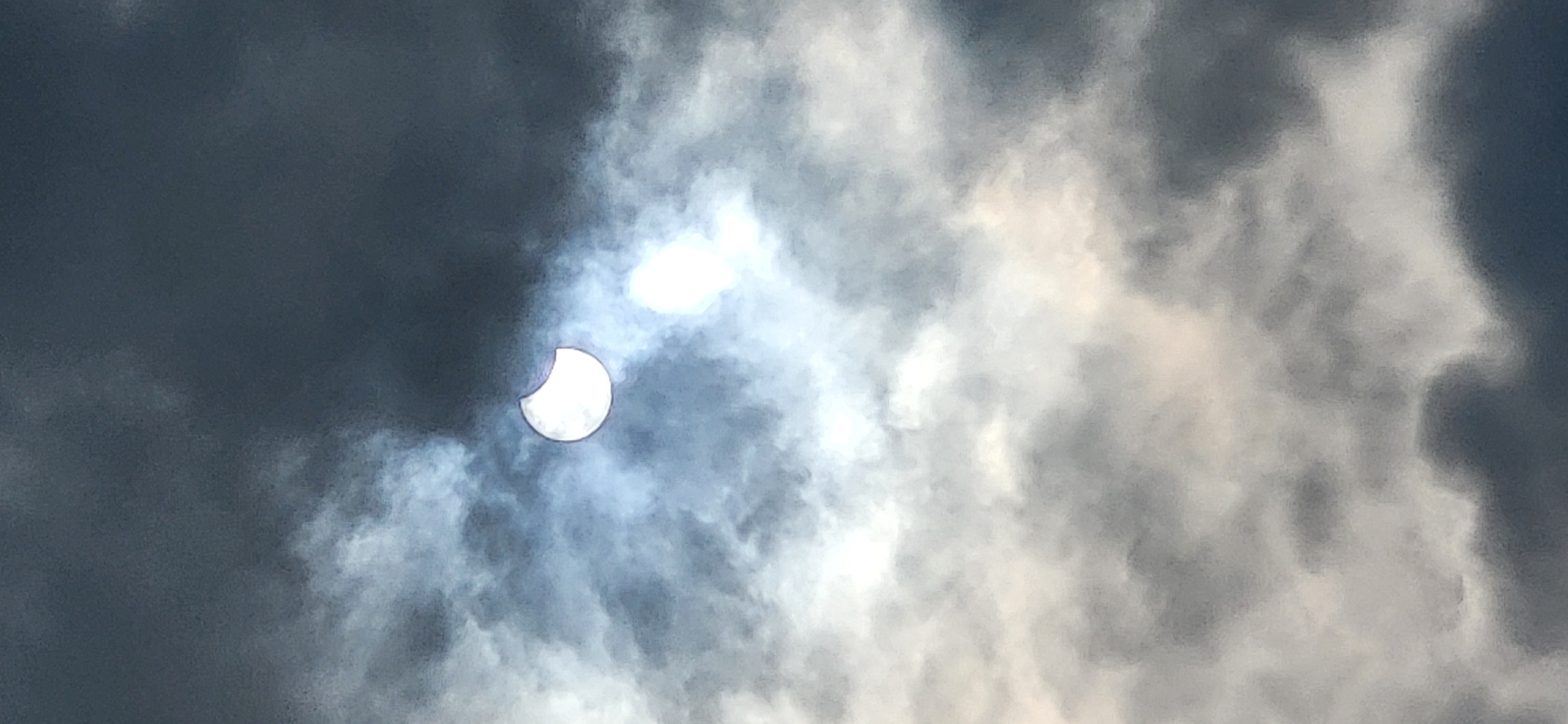 Mit etwas Glück reduzierten die Wolken kurz die Helligkeit der partiellen Sonnenfinsternis, so dass eine Fotografie ohne Filter möglich war. Die Handykamera wurde auf einem Stativ grob zur Sonne ausgerichtet. Es war kein Blick durchs Okular nötig.
