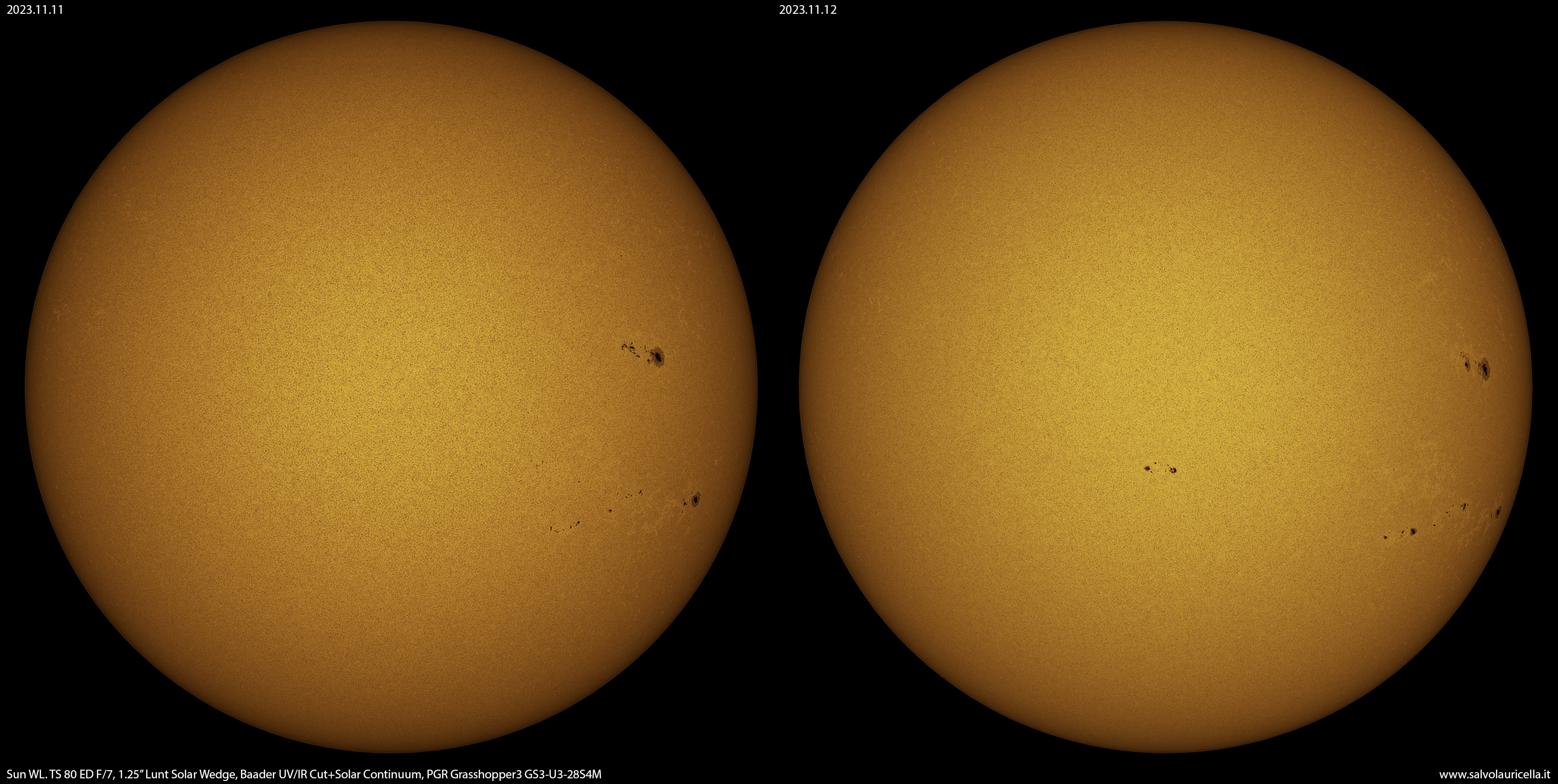 Solar disk imaged in visible light on 11. and 12. November 2023. Note in addition to the movement, the appearance of a new group of sunspots.