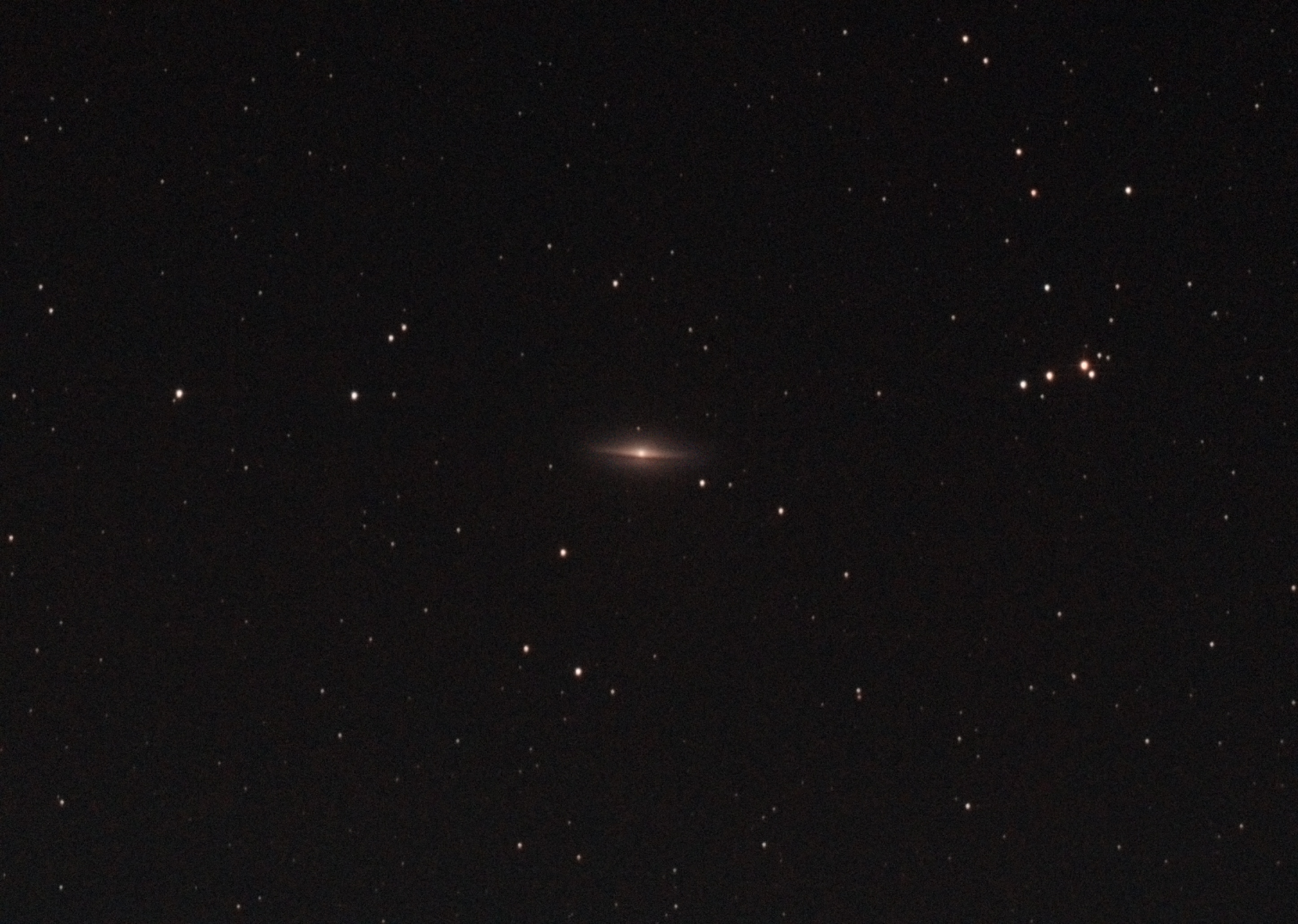 Bevor ich mich der berühmten Black Eye-Galaxie Messier 64 widmete, hatte ich mich am Abend des 20. Mai 2015 zu Testzwecken (mehr war absolut nicht drin) noch der Sombrero-Galaxie Messier 104 photonensammelmäßig zugewandt. Auch hier gilt: Bei wesentlich mehr Belichtungszeit kann man selbst mit kleinen Instrumenten erstaunlich viel herausholen. So ist bereits schon jetzt deutlich das markante Staubband der Galaxie zu erkennen und das bei einer Belichtungszeit in Summe von nur rund 22 Minuten.