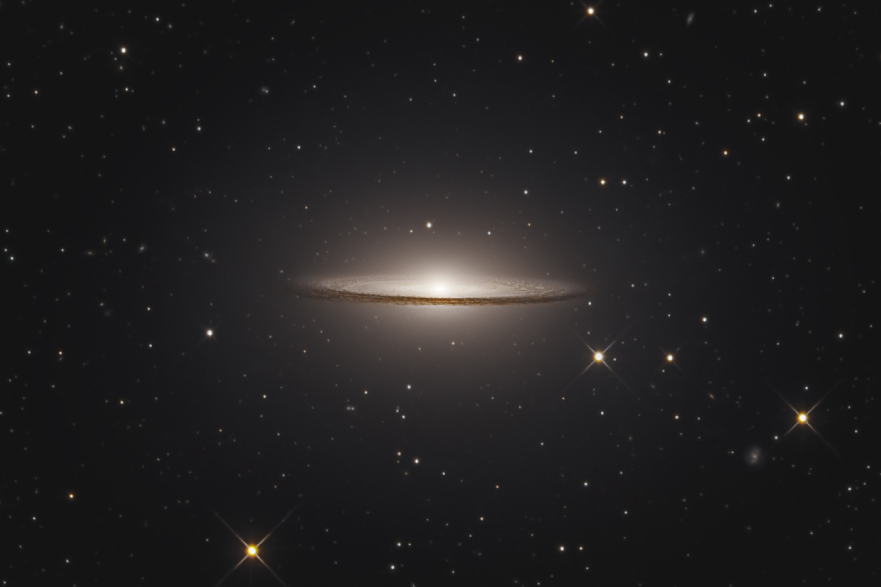 Die Spiralgalaxie Messier 104 (NGC 4594), die wegen ihres optischen Erscheinungsbilds auch Sombrerogalaxie genannt wird, ist im Sternbild Jungfrau zu finden, ihre Entfernung zur Erde beträgt 30 Millionen Lichtjahre. Ich bezeichne solche Objekte gern als Horizontkratzer, da sie sich in unseren Breiten, selbst im Meridiandurchgang, nicht sehr hoch über den südlichen Horizont hinaus bewegen. Einige Gasnebel des südlichen Himmels habe ich zwar schon fotografiert, aber eine Galaxie, die sich kaum mehr als 25 Grad über den Horizont erhebt, ist noch einmal eine ganz andere Dimension. Galaxien, mit ihren feinen Spiralstrukturen, erfordern möglichst gutes Seeing während der Aufnahme, was aber in Horizontnähe nur äußerst selten, wenn überhaupt, der Fall ist. Erschwerend kommt in diesem speziellen Fall noch die sehr geringe Winkelausdehnung von nur 8,7x3,5 Bogenminuten hinzu. Eigentlich ein Fall für die lange Brennweite meines Newton-Cassegrain, aber wegen des kurzen Zeitfensters für die Aufnahme in Meridiannähe, habe ich den Einsatz des Reducers vorgesehen und damit die Lichtstärke des Instruments erhöht. So konnte ich in nur zweieinhalb Stunden genügend Photonen für eine gute Durchzeichnung des Objekts sammeln.