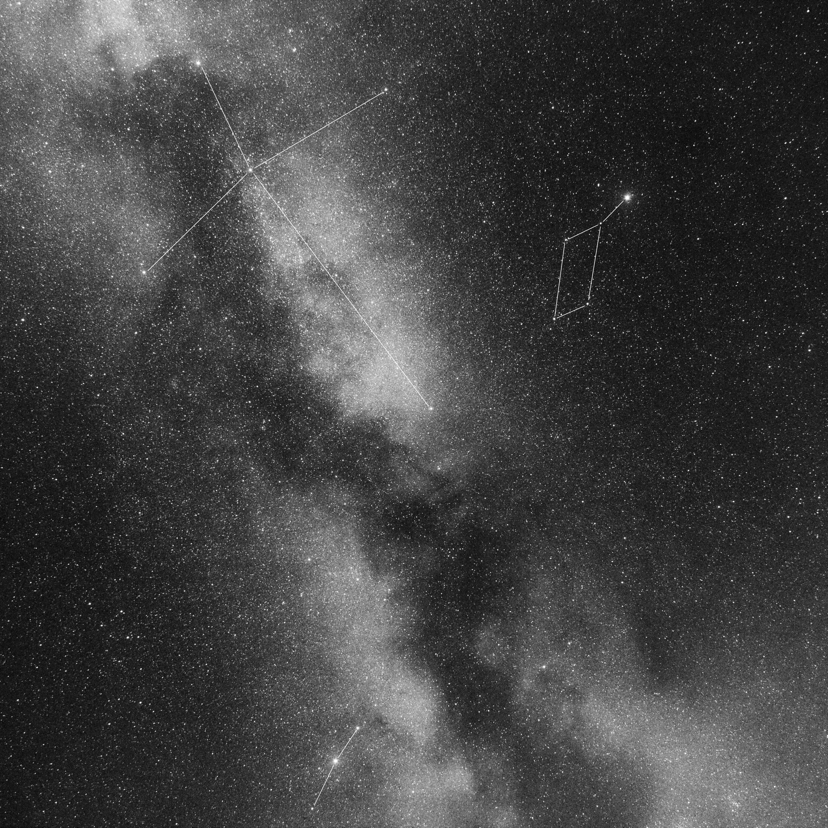 Die Milchstraße im Sommerdreieck ist immer ein dankbares Fotoobjekt. In S/W wird meines Erachtens die Ästhetik noch verstärkt und entspricht dem Anblick mit bloßem Auge besser als eine Farbaufnahme.