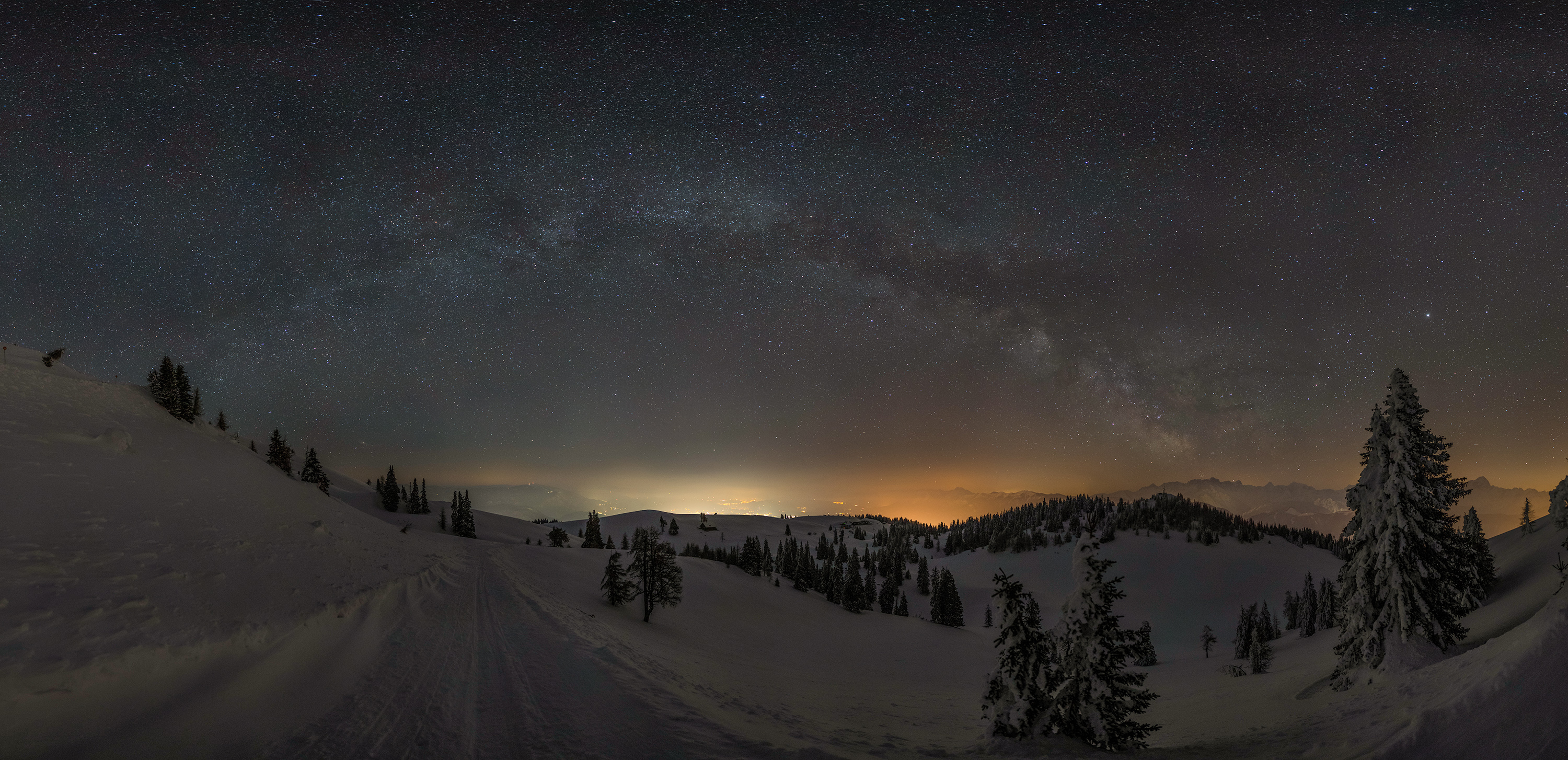 In den frühen Morgenstunden, am 22. März 2018, konnte ich dieses Panorama aus 40 Bildern in drei Reihen von der Sommermilchstraße über Villach aufnehmen. -10 Grad Celsius zeigte das Thermometer. Die Stimmung auf der Villacher Alpe (Dobratsch) war atemberaubend. Als Kamera diente die Nikon D750 und als Optik verwendete ich das Sigma 20 mm f/1,4 bei ISO 1250 und sechs Sekunden Belichtungszeit. Jupiter, Mars und Saturn sind in der Aufnahme versteckt.